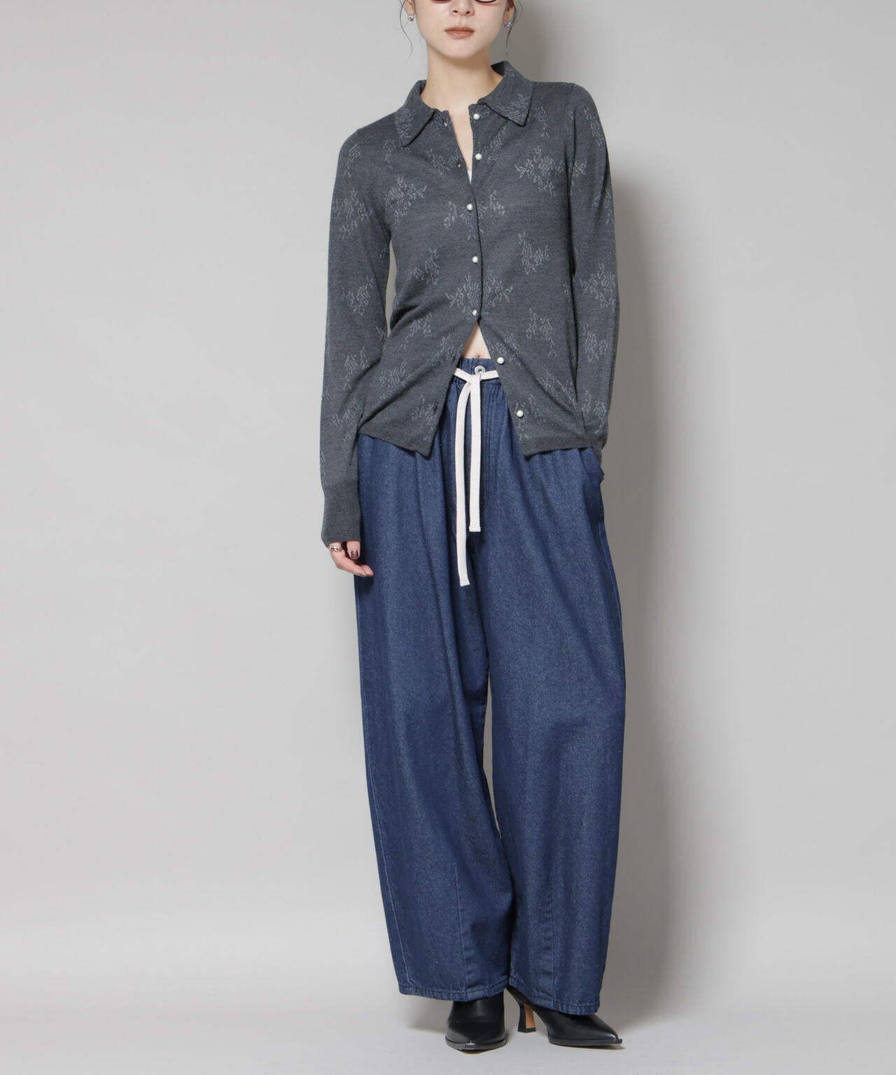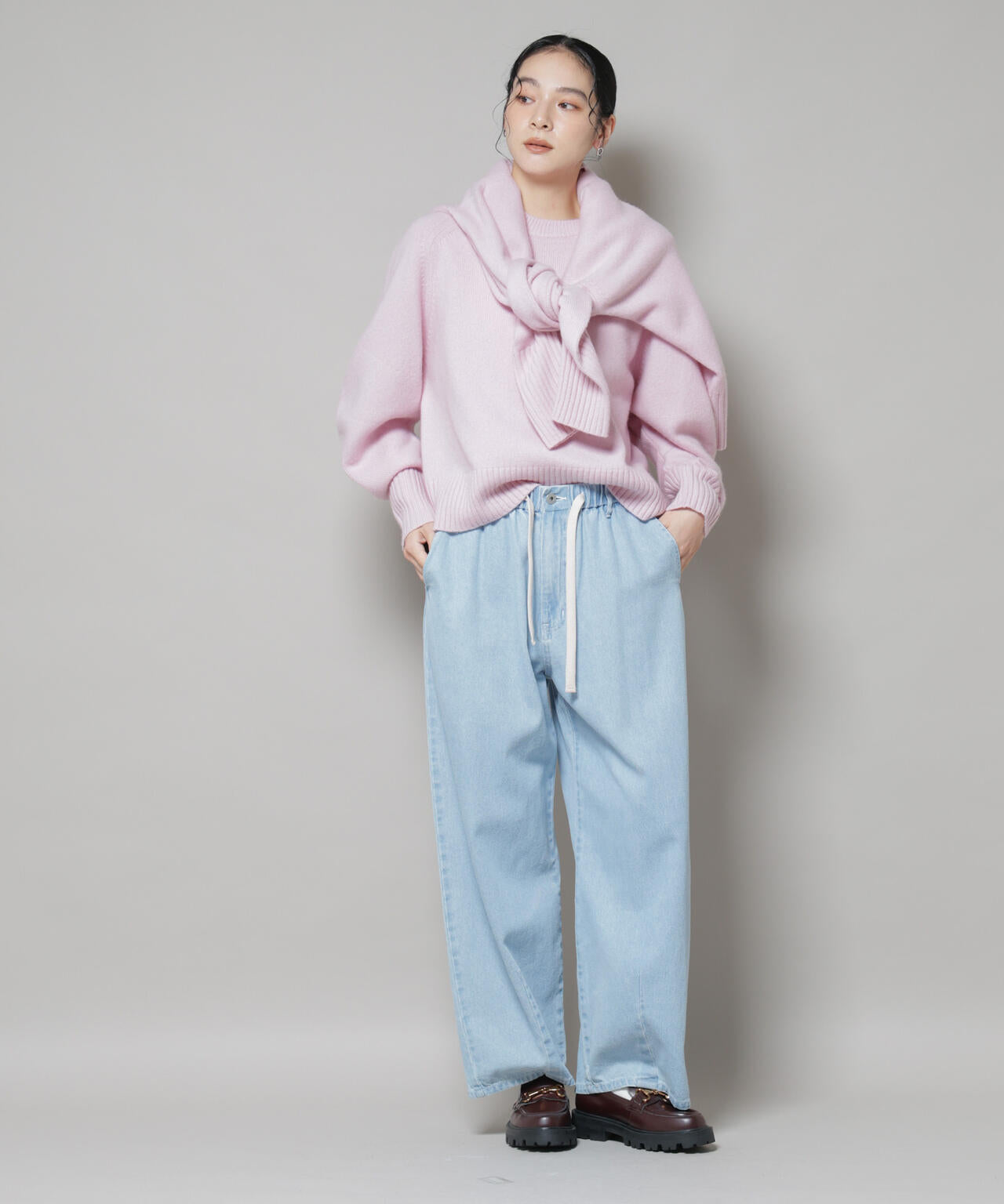 膨らみのある柔らかいデニム生地で仕立てたドロストパンツ。ワイドシルエットながらも裾にかけて絶妙に窄まるデザインで、すっきりと穿きこなせる1本です。