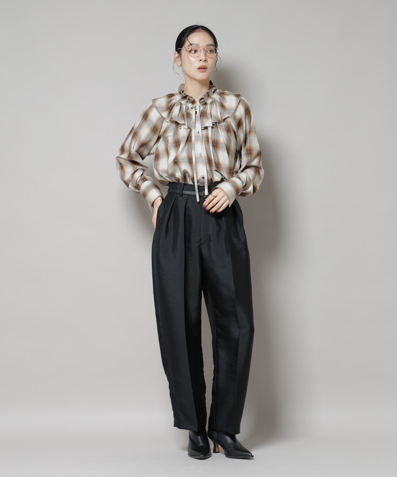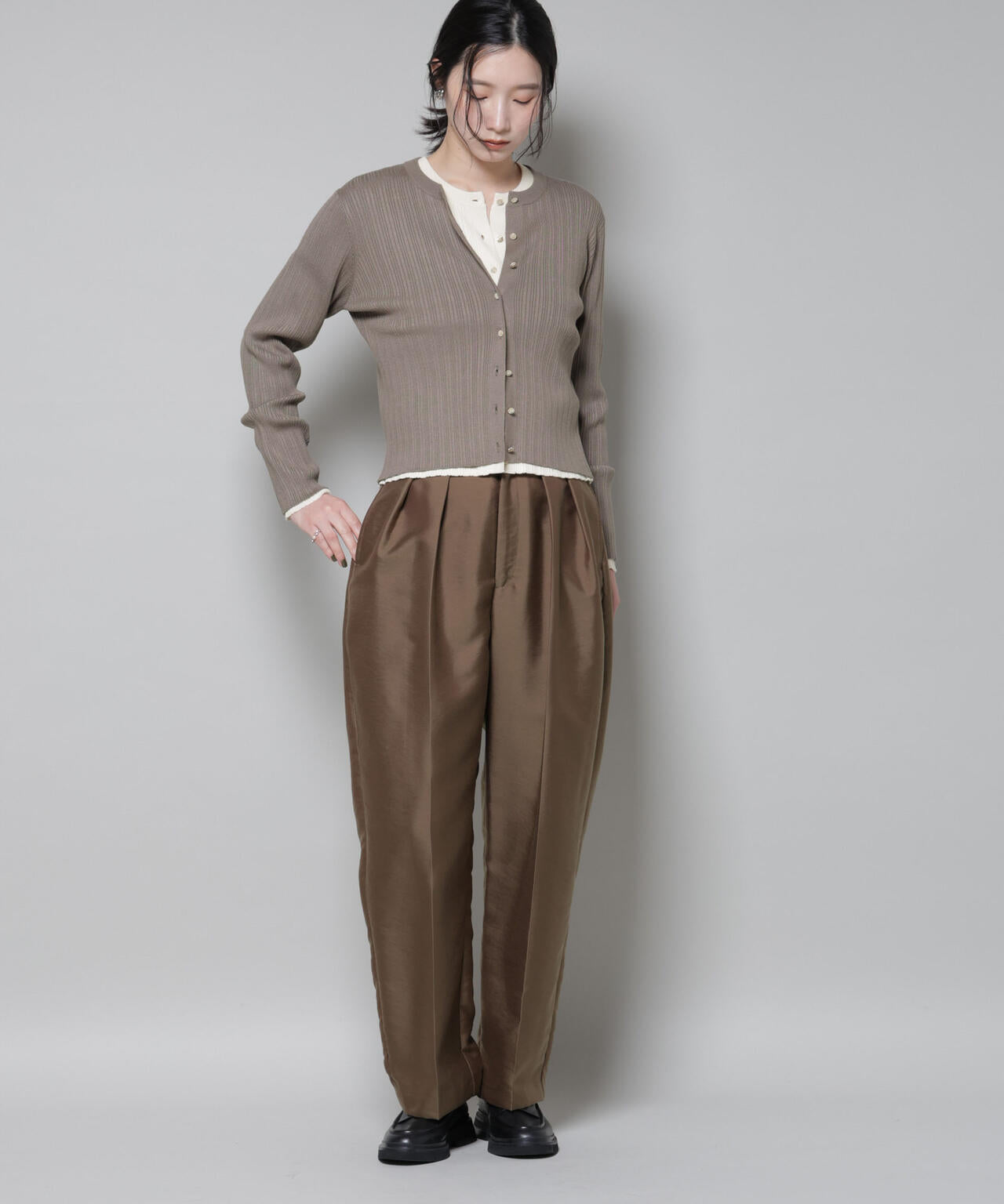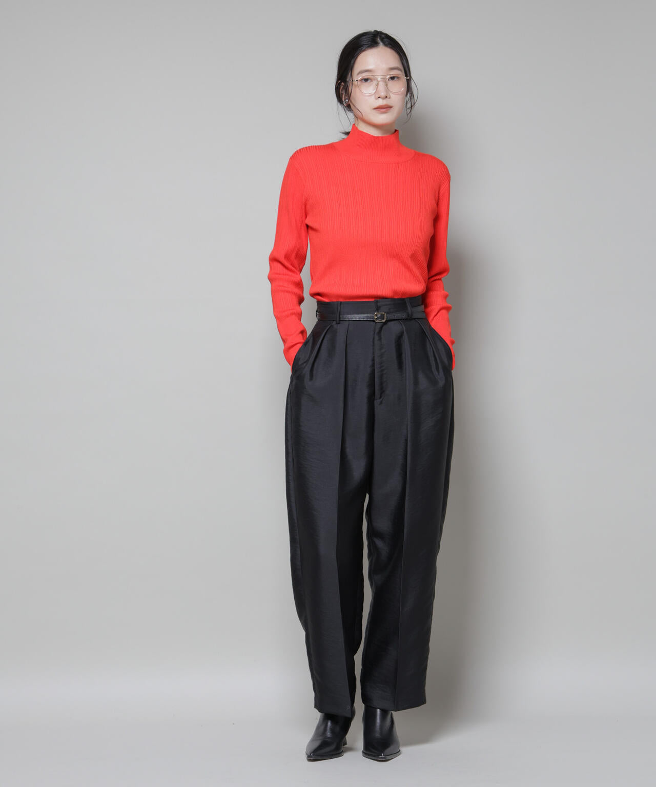 • コンパクトなトップスをタックインしたり、短丈トップスを合わせれば、すっきりとしたモードな印象に