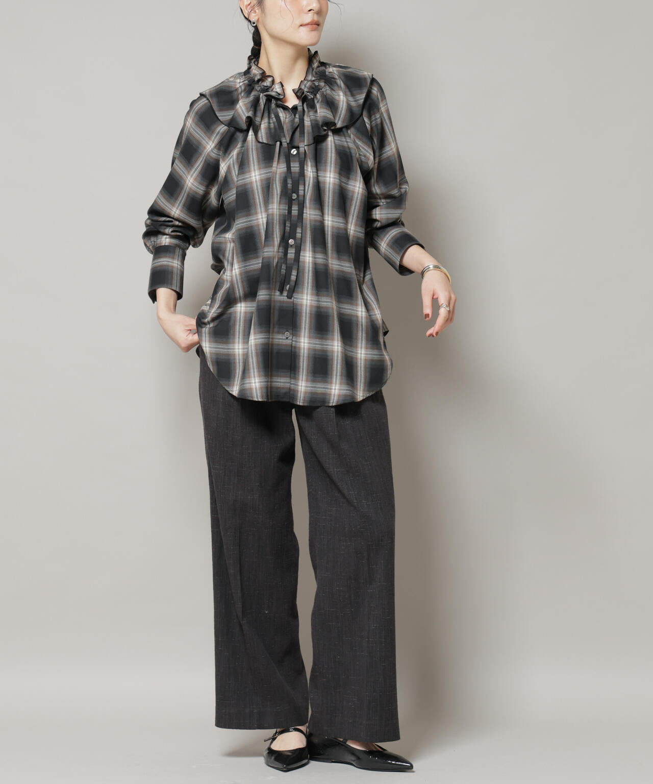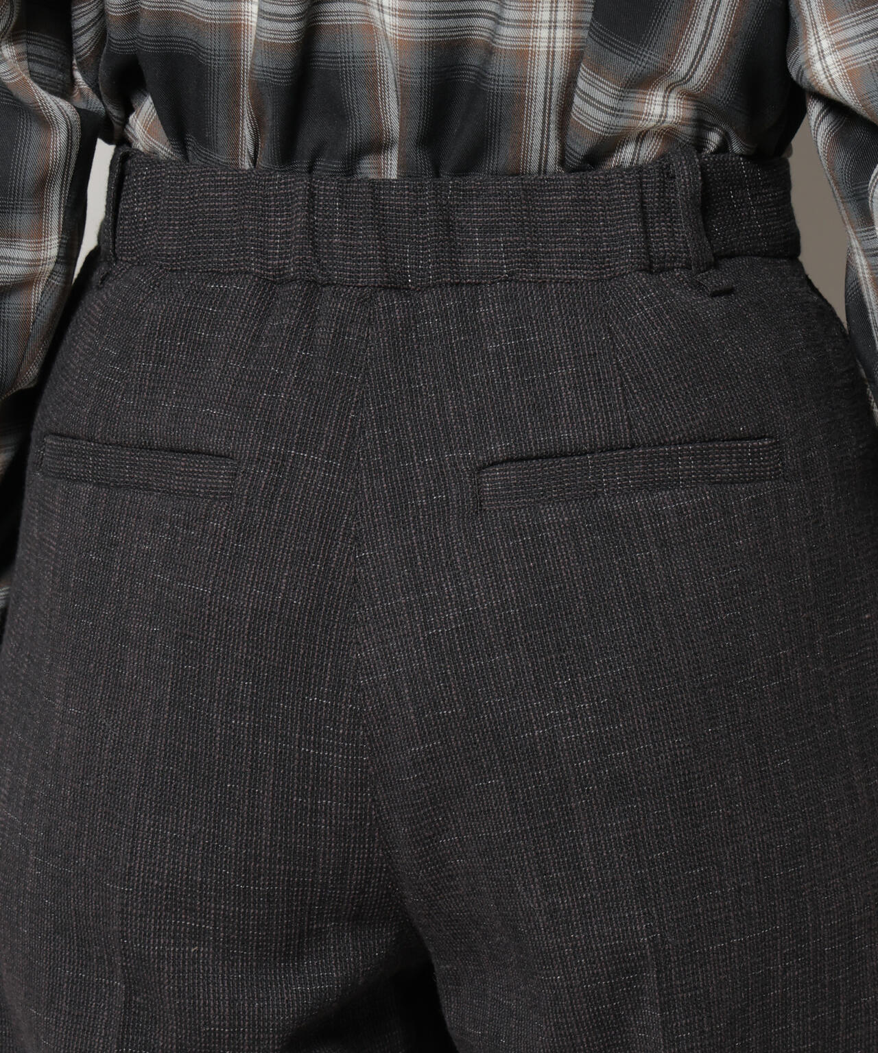 ほんのりラメの入ったクラシックなツイードパンツ。ストンとしたセミワイドシルエットにセンタープレス入りですっきり見えつつも、フロントの1タックが体型カバーを叶えてくれるデザインです。