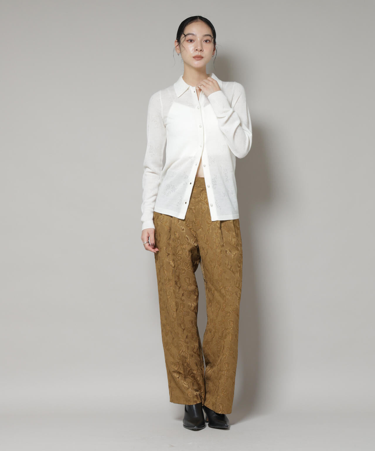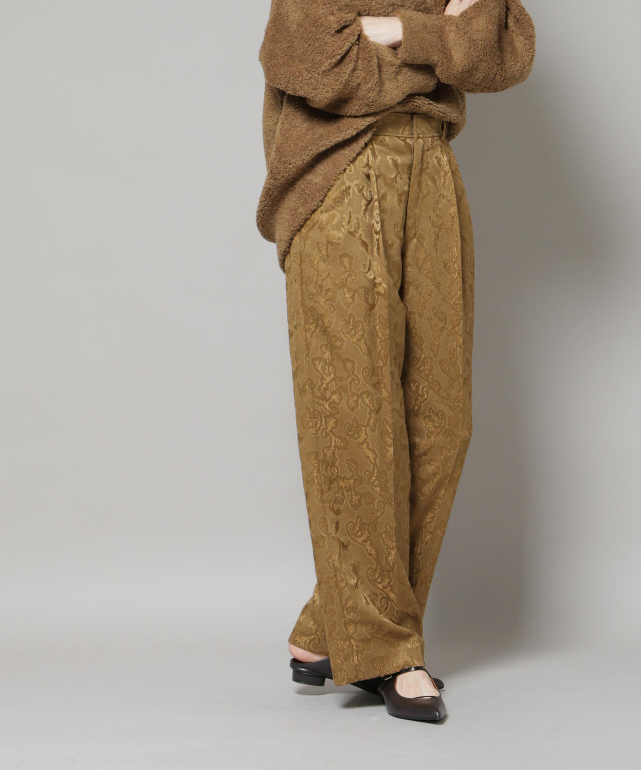 上品な光沢感のあるボタニカル柄ジャガード生地で仕立てたワイドパンツ