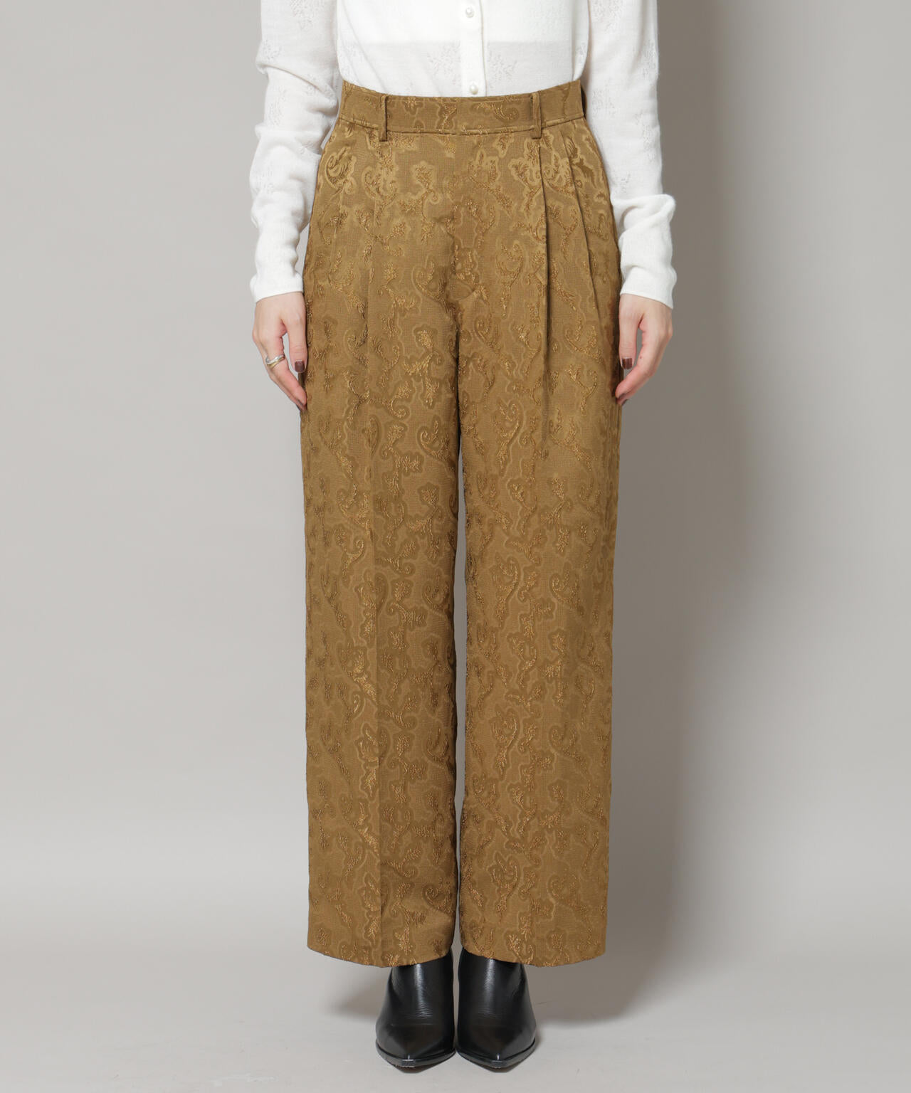 上品な光沢感のあるボタニカル柄ジャガード生地で仕立てたワイドパンツ。オケージョンはもちろん、きれいめカジュアルにもマッチする大人の為の上品な一本です。