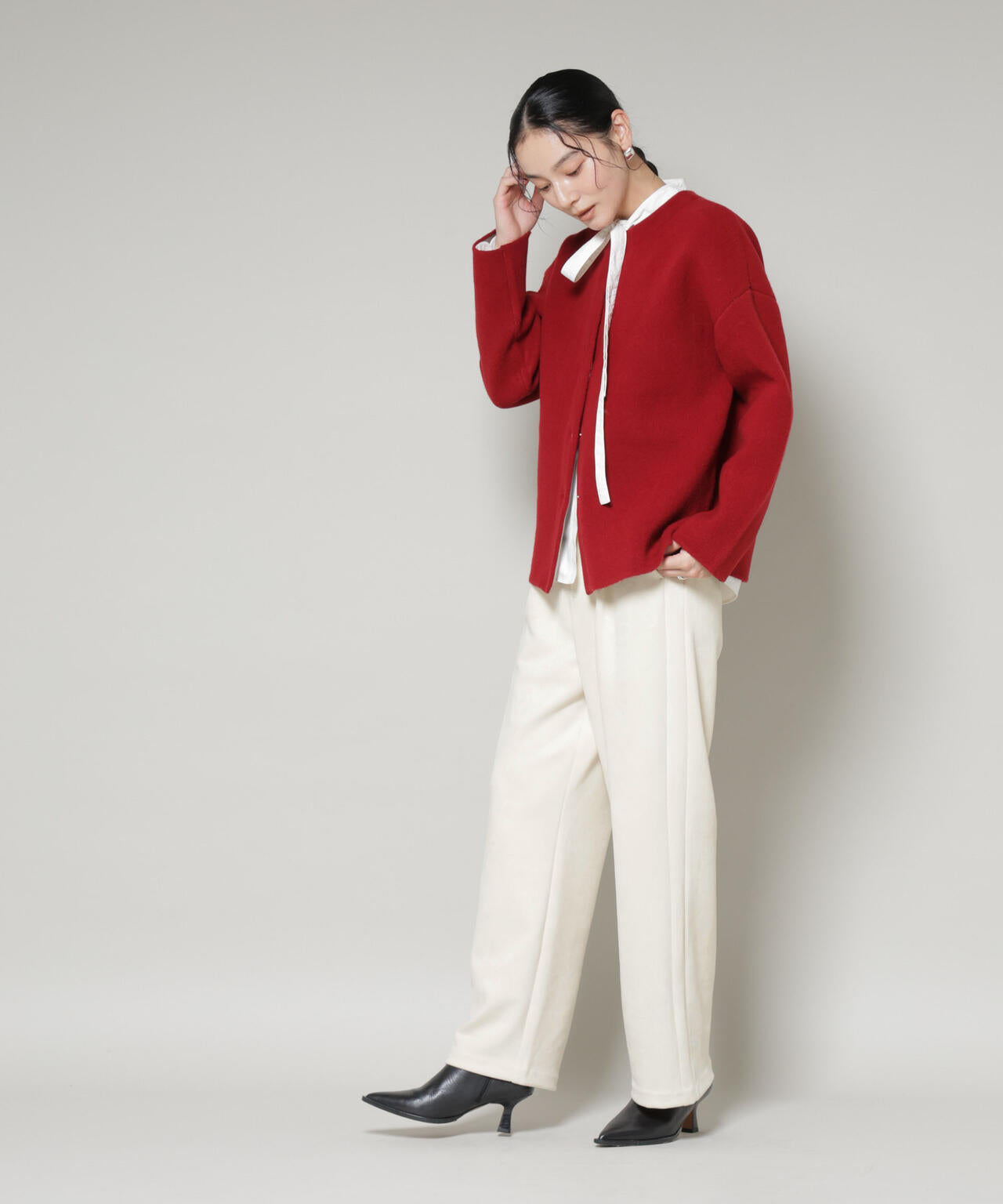 ・ニットやショート丈アウターを合わせた女性らしいスタイリングがおすすめ