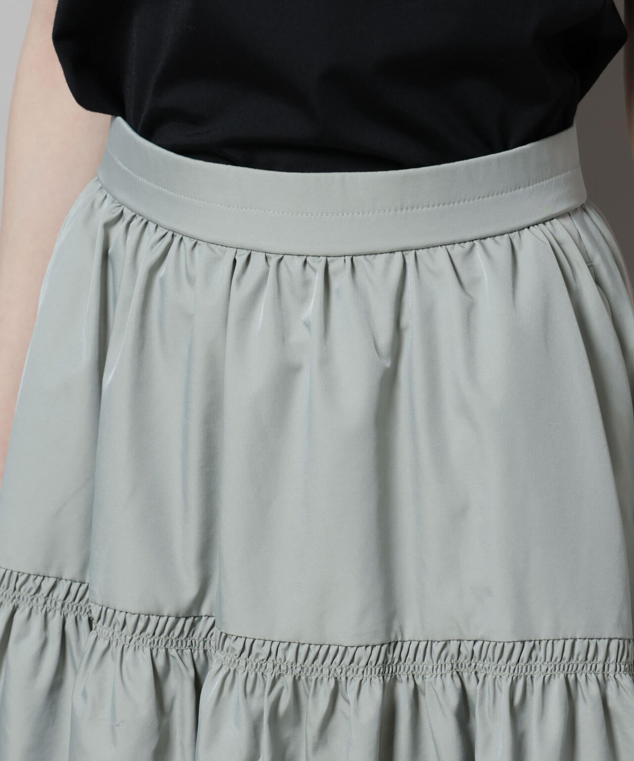 艶やかなシャンブレータフタ素材で仕立てたティアードギャザースカート