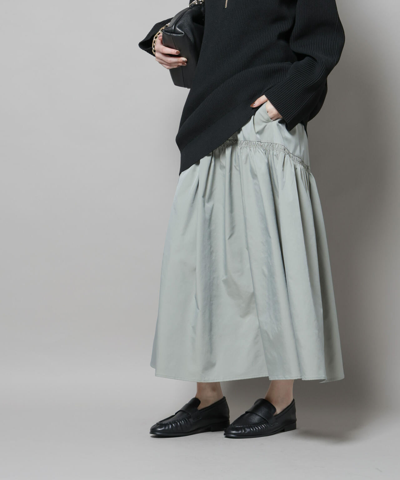 ギャザーで膨らみをもたせ、歩くたびにふんわりと広がるシルエットが魅力