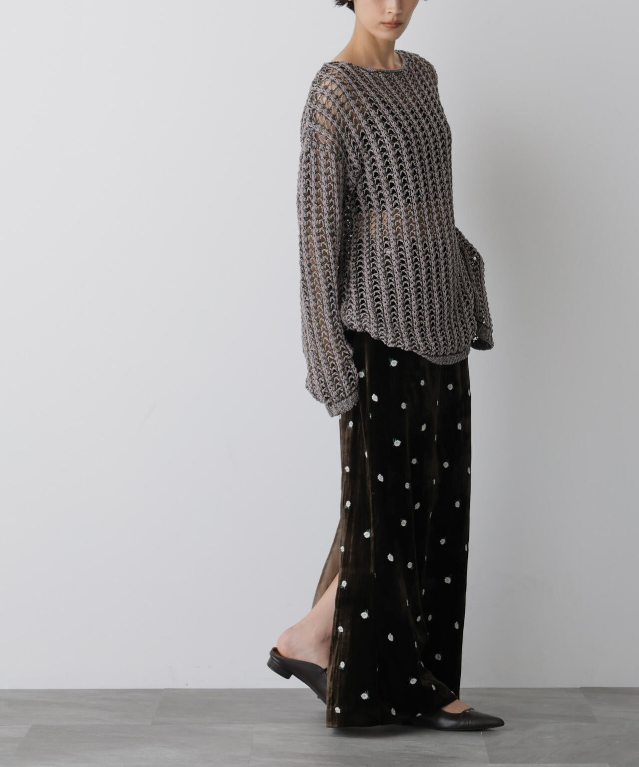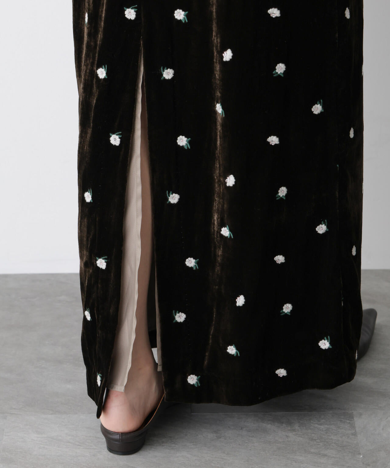 今季ローンチした新レーベル「Stevelour(スティーブロア)」のロングスカート。スリットから微配色の裏地がちらりとのぞき、動くたびに表情が変わるデザインがポイントの一着です。