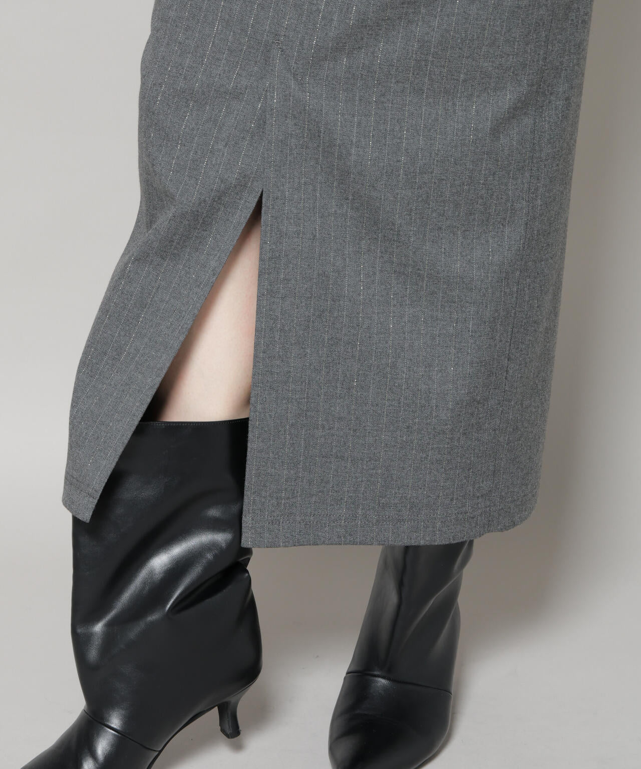 クラシカルなスーチング素材にラメ糸を練り込んだストライプが上品に輝くスカート。日常から特別なシーンまで幅広く活躍し、すっきりと縦長ラインを強調する美しいシルエットが魅力です。