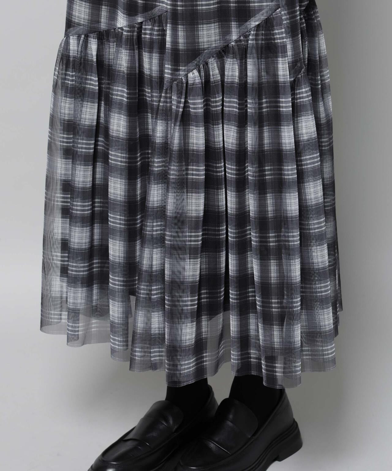 軽やかなネットチュールにオンブレーチェックのプリントを施した、表情豊かなティアードスカート