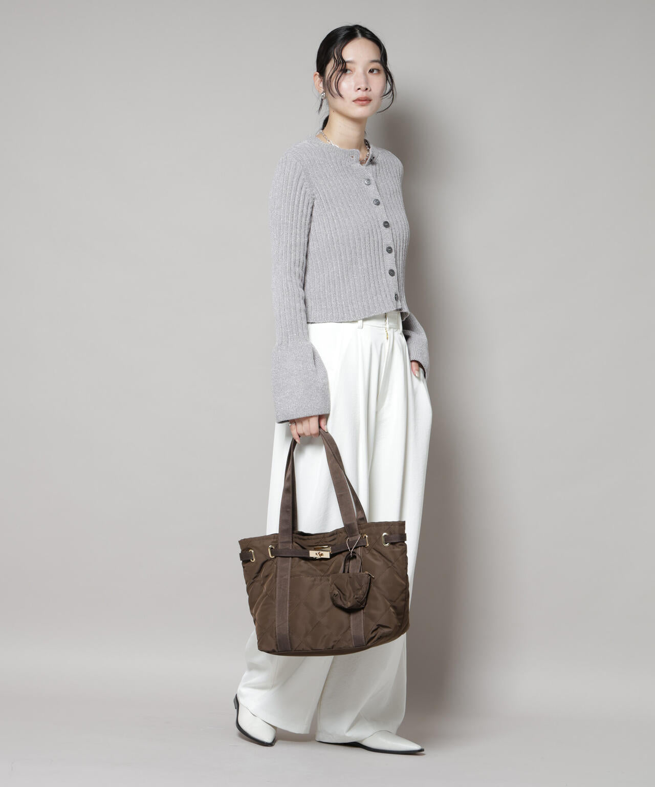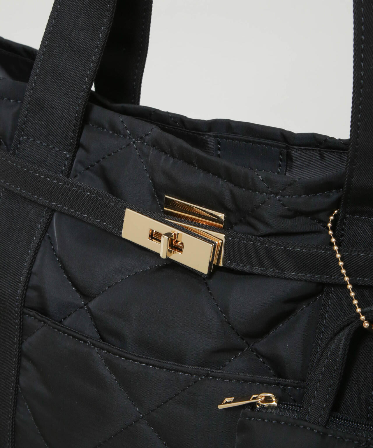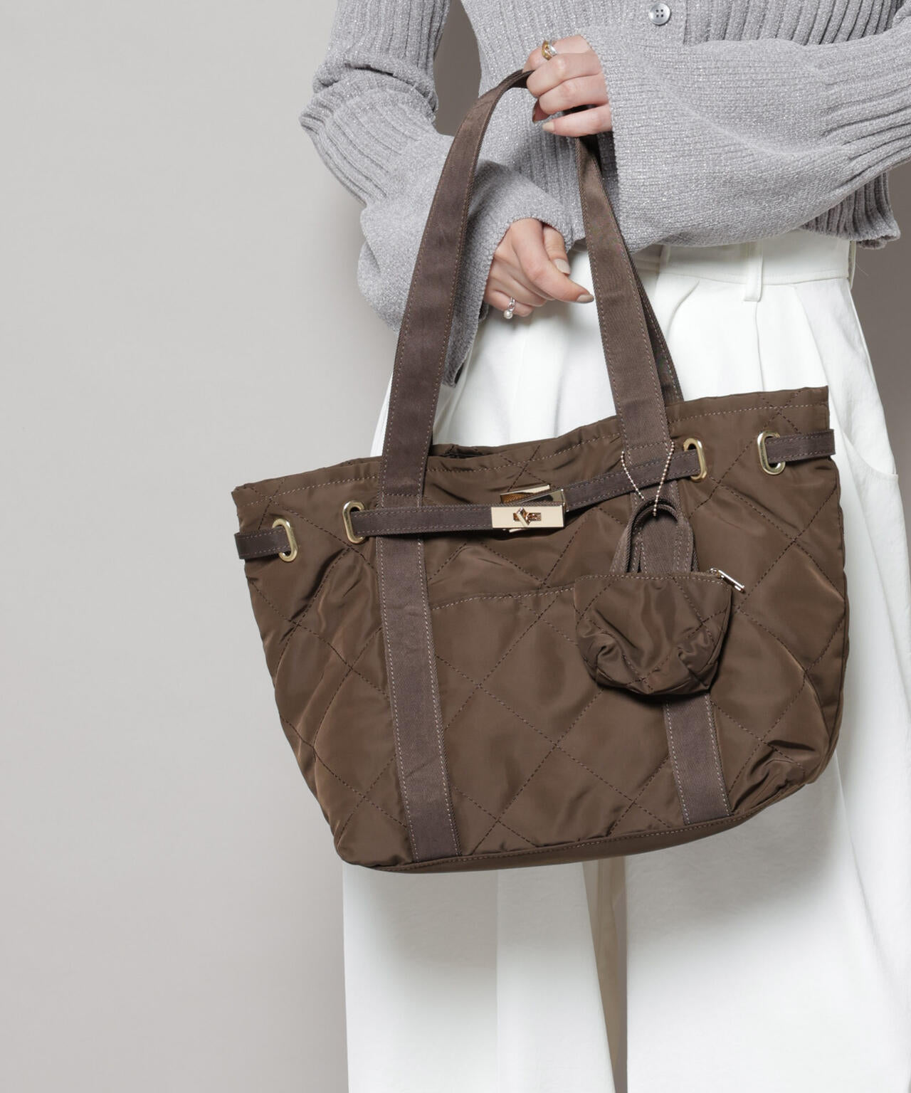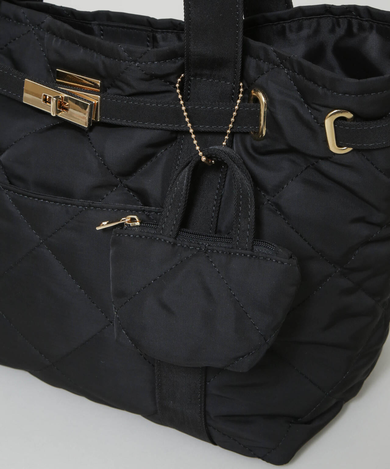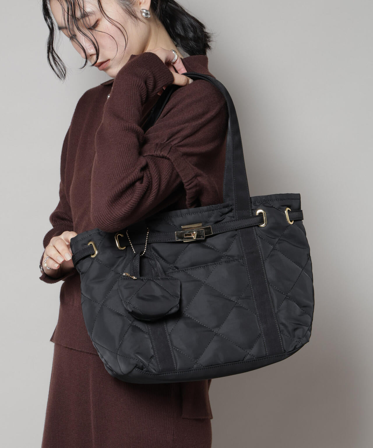 ナイロン素材のキルティング加工が施された、大人の遊び心をくすぐるトートバッグ。ミニチュアサイズのトート型チャームがアクセントとなり、Y2Kライクなテイストをプラス。リップやイヤホンなど小物収納にも使えて、見た目の可愛さと実用性を兼ね備えたひと品です。