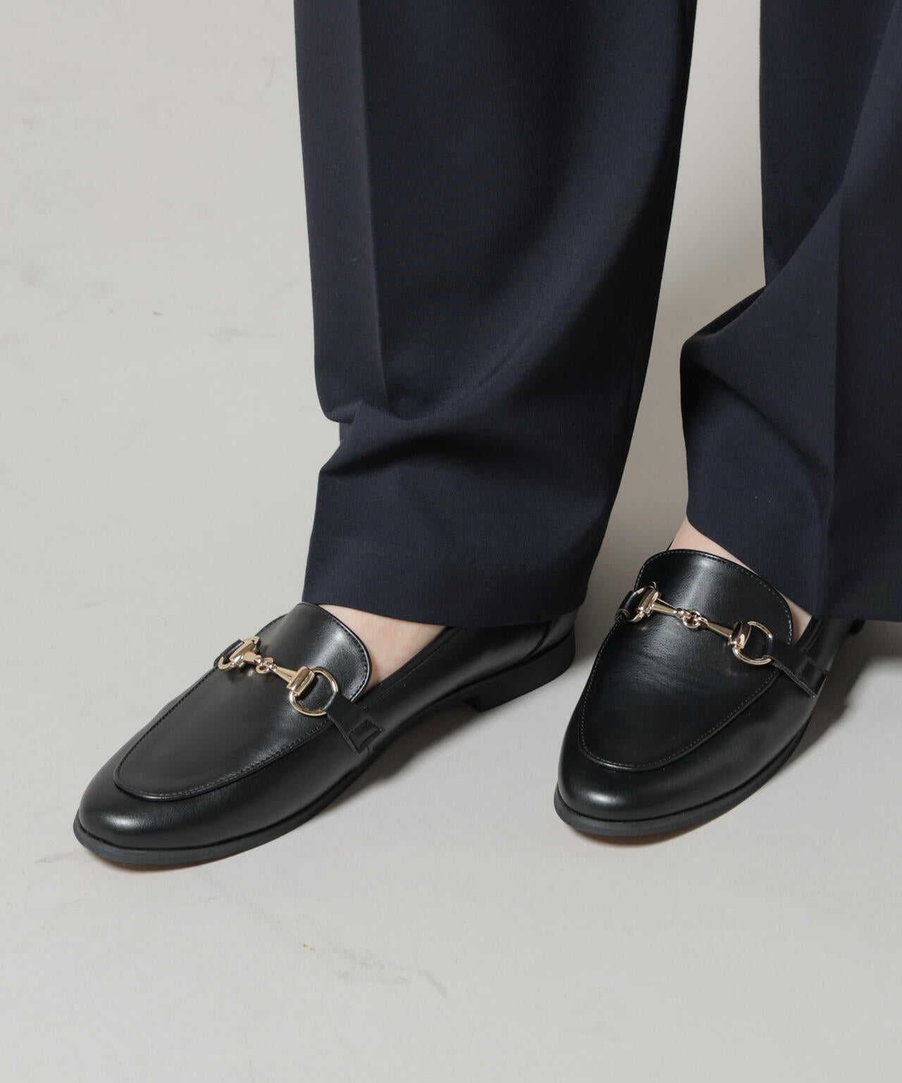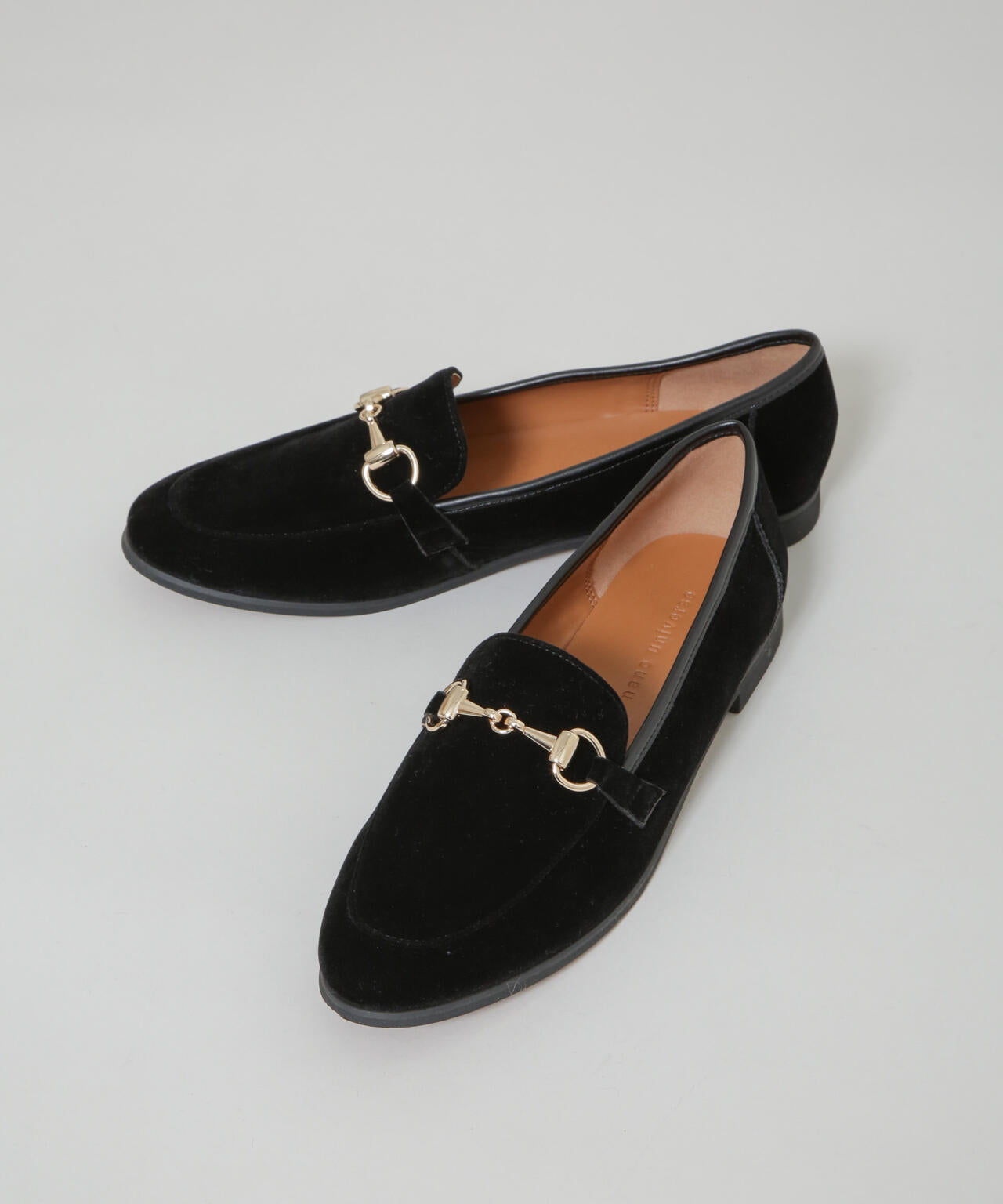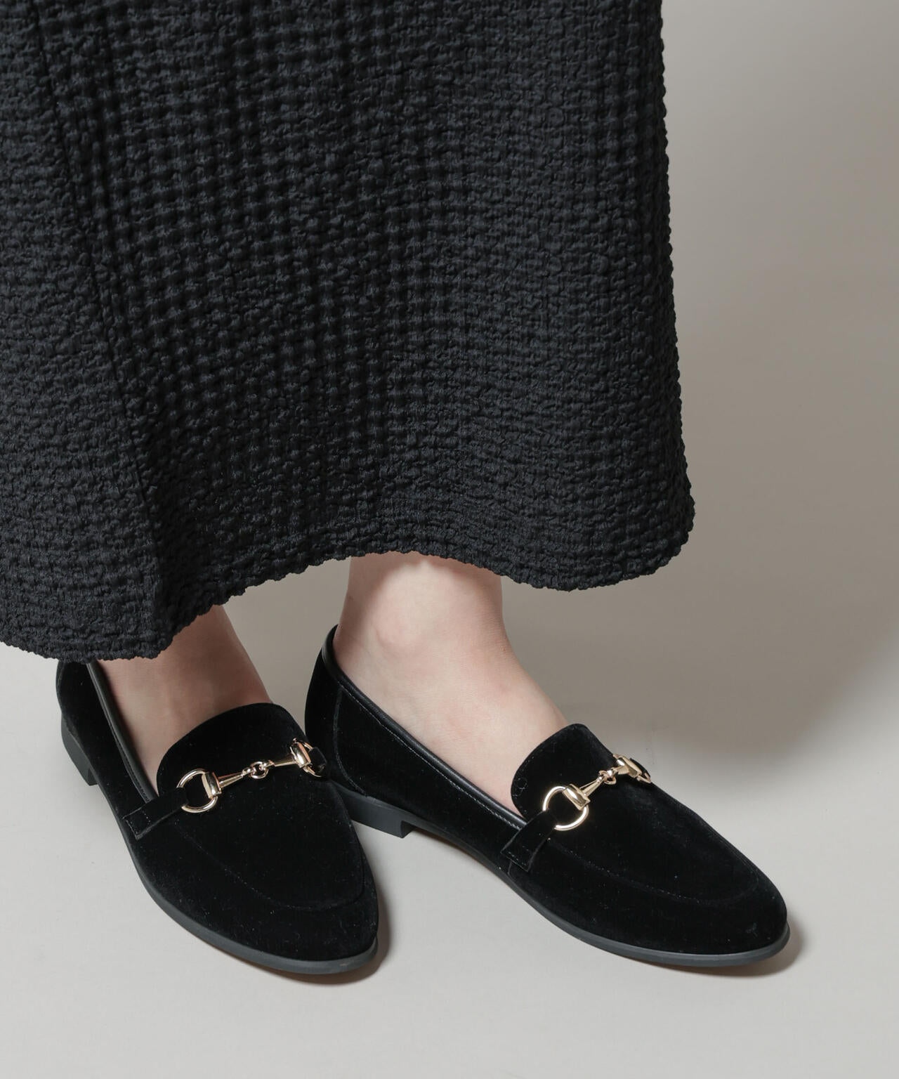 アッパーの金具ディテールが効かせるビットローファー。定番のレザー調とベロアの2素材展開で、シーズンムードが高まるルックスに仕上げました。トレンドのルーズソックスやラメソックスを合わせたり、ソックス+デニムスタイルもおすすめです。