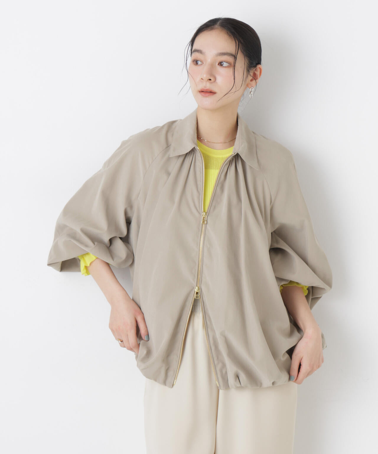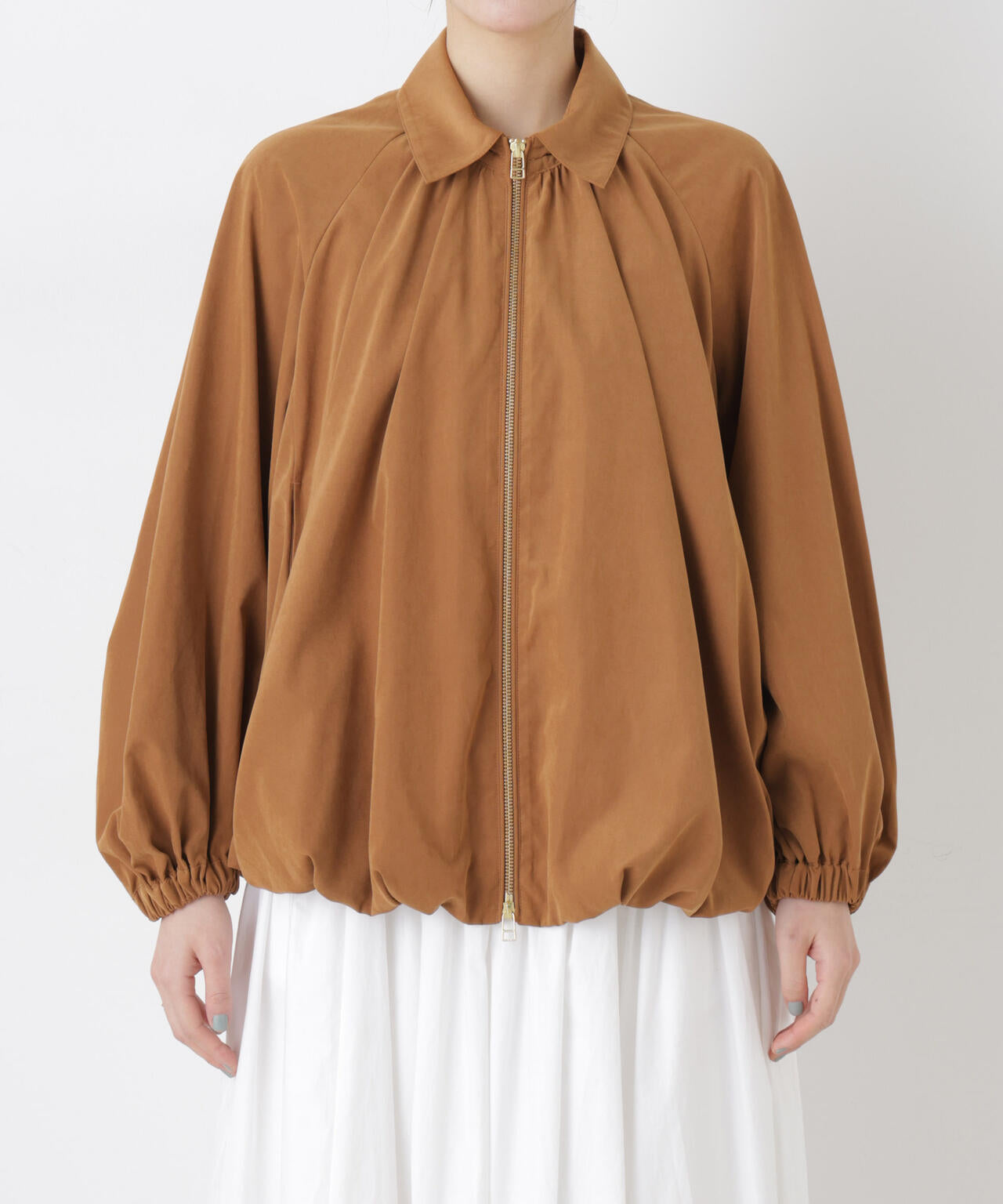 フェイクスエードタッチな春素材で仕立てたバルーンブルゾン。裾と袖口はゴム仕様のたっぷりとしたボリューム感で、着るだけで新鮮なスタイルに仕上がる一着です。