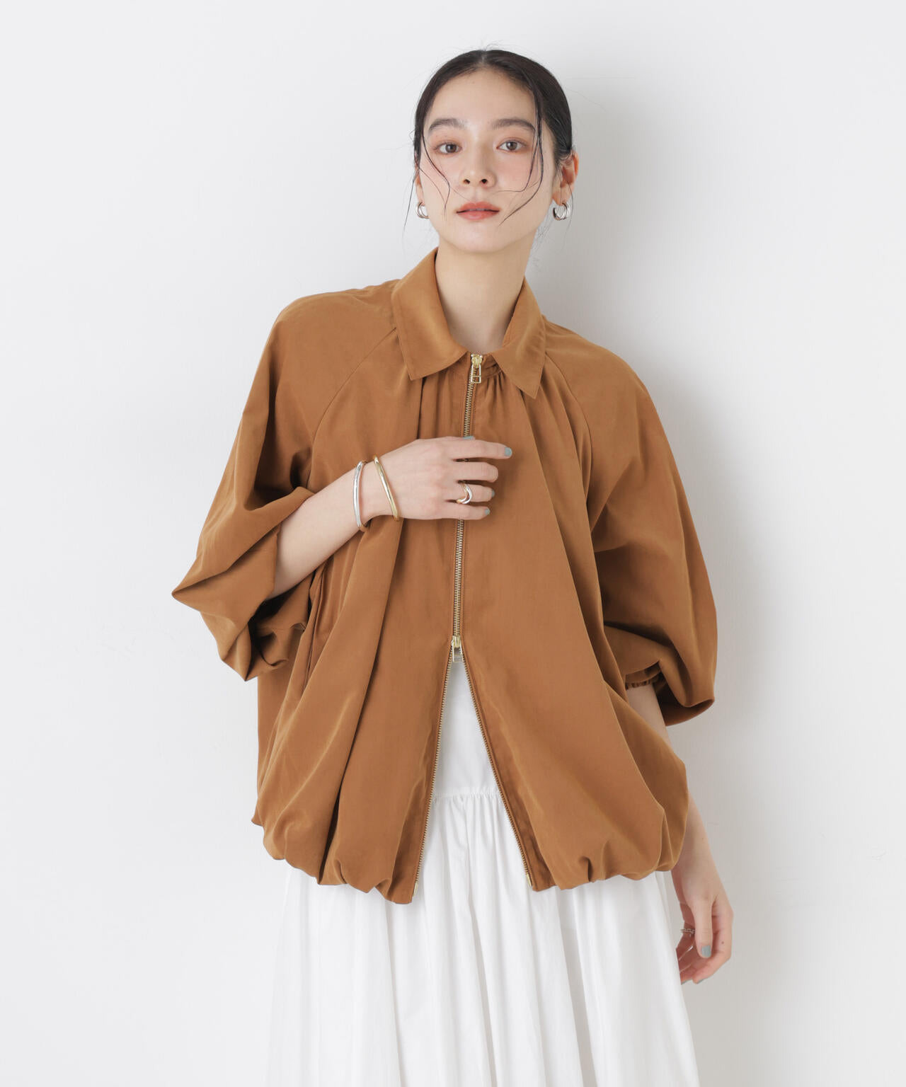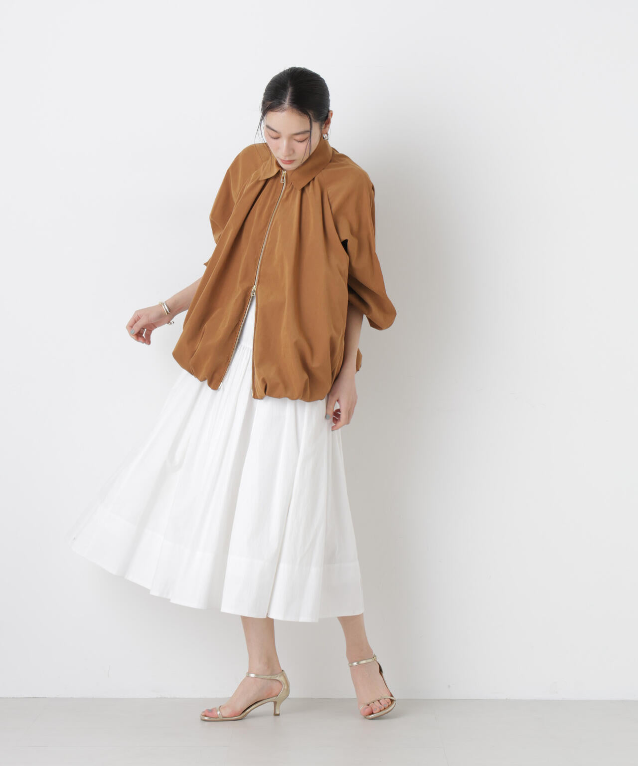 キャメルのブルゾンにホワイトのひざ丈ボリュームスカートで新しいバランスの着こなしもおすすめ
