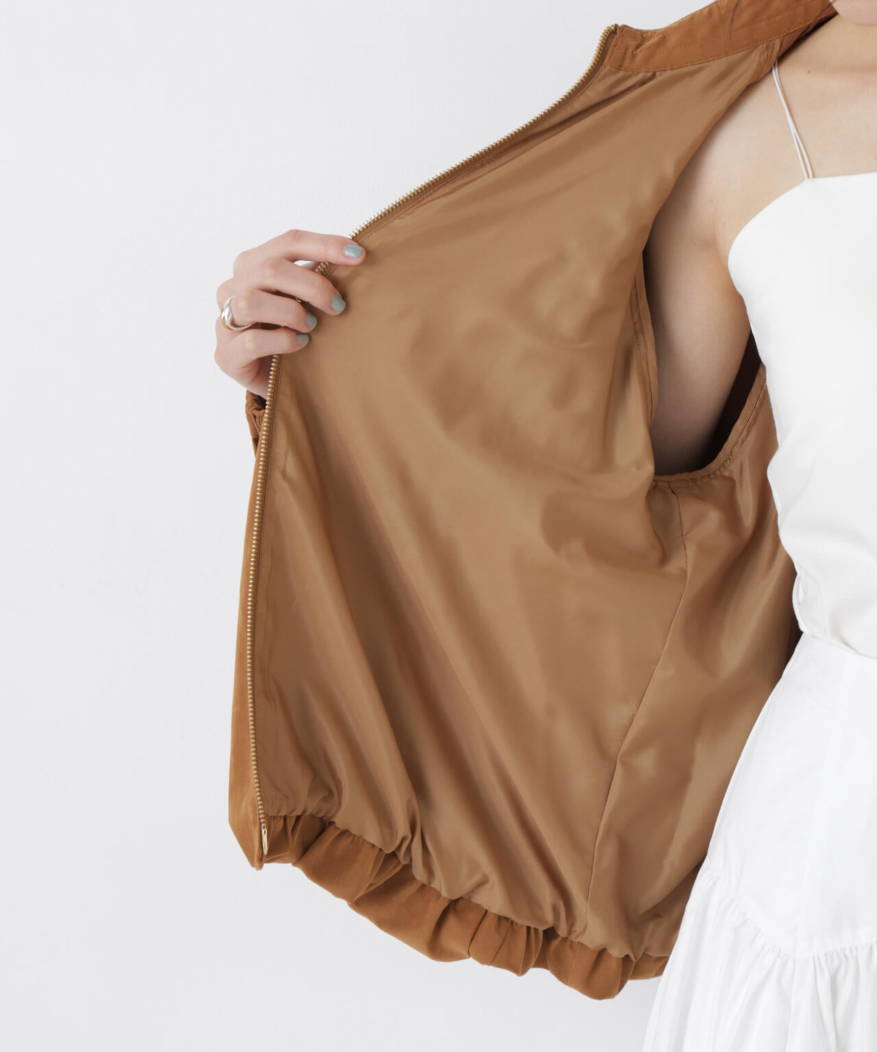 ・キャメルのブルゾンにホワイトのひざ丈ボリュームスカートで新しいバランスの着こなしもおすすめ
