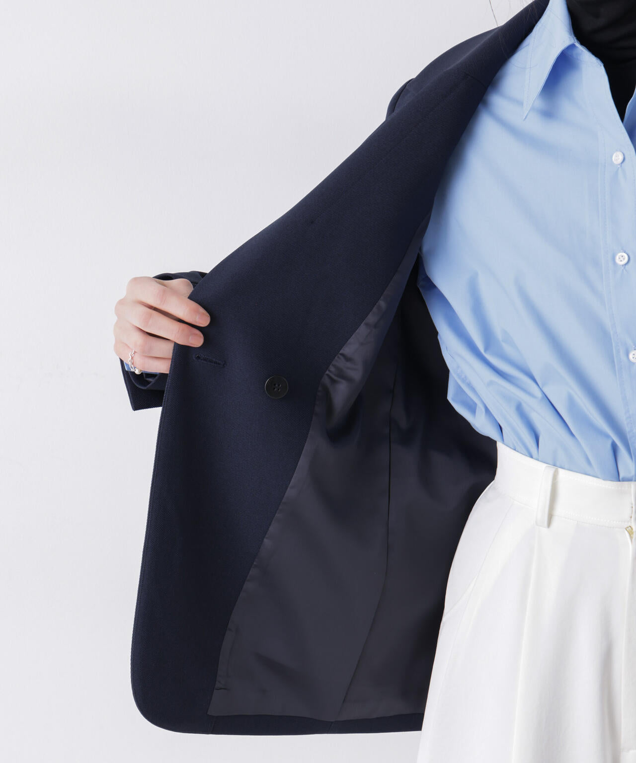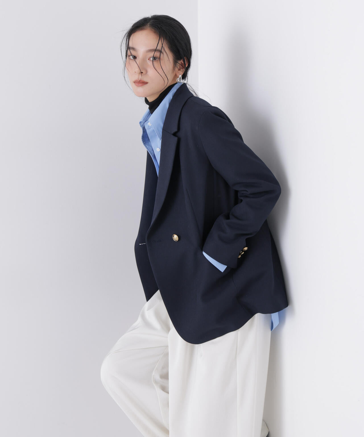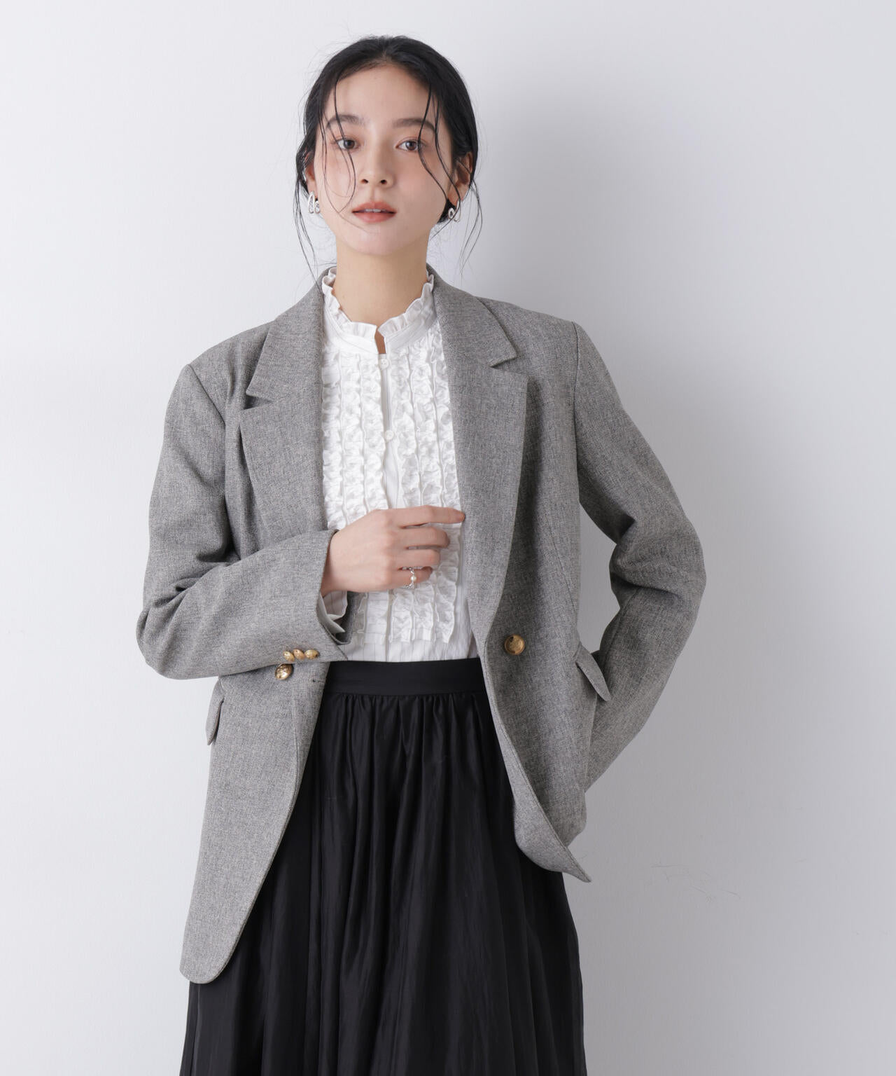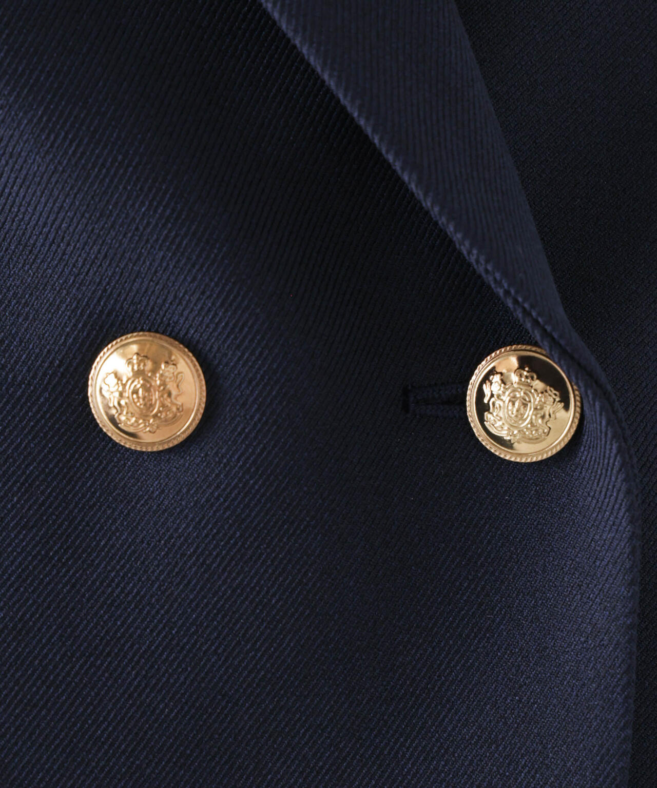 立体感のあるエンブレム金ボタンがポイントのツイディーなテーラードジャケット。一段のダブルデザインとフロントのカーブをつけたカッティングラインで、羽織った時も重くなりすぎず、女性らしいシルエットを演出します。
