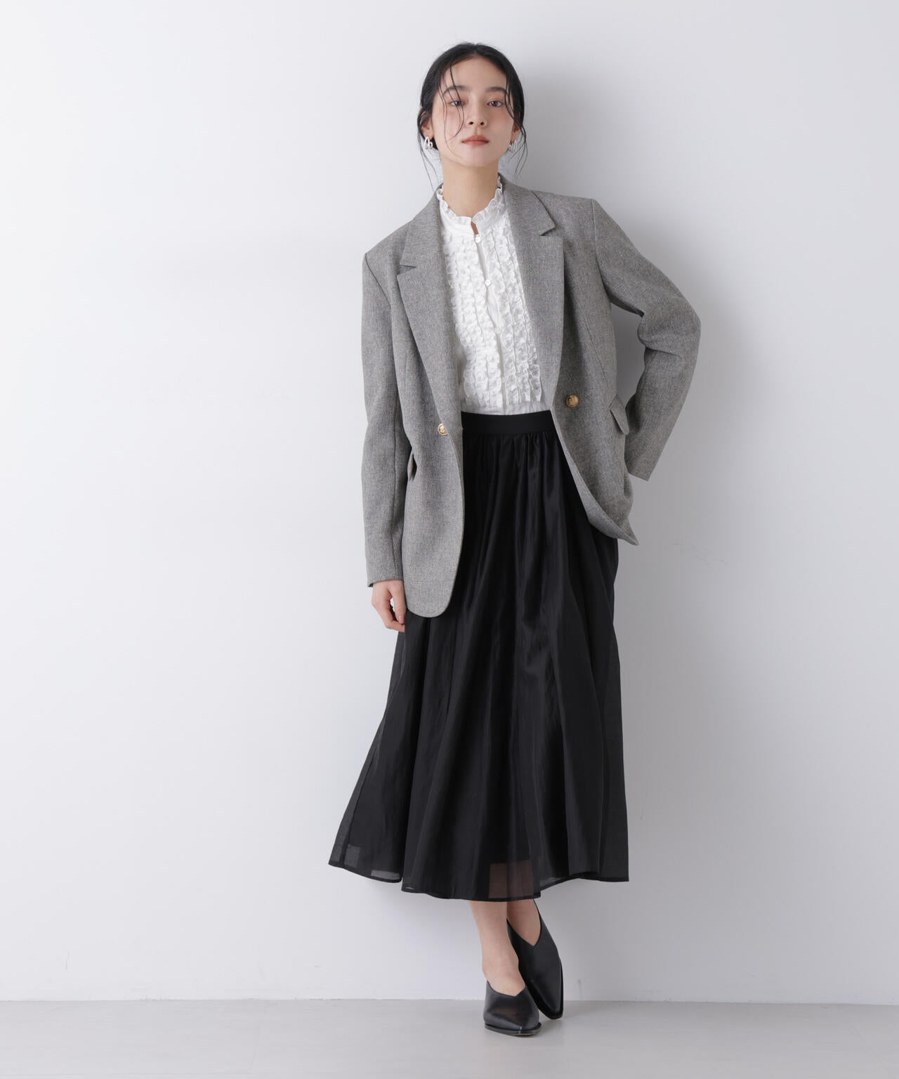 マニッシュな雰囲気があるので、女性らしい柔らかなアイテムと組み合わせると好バランス◎