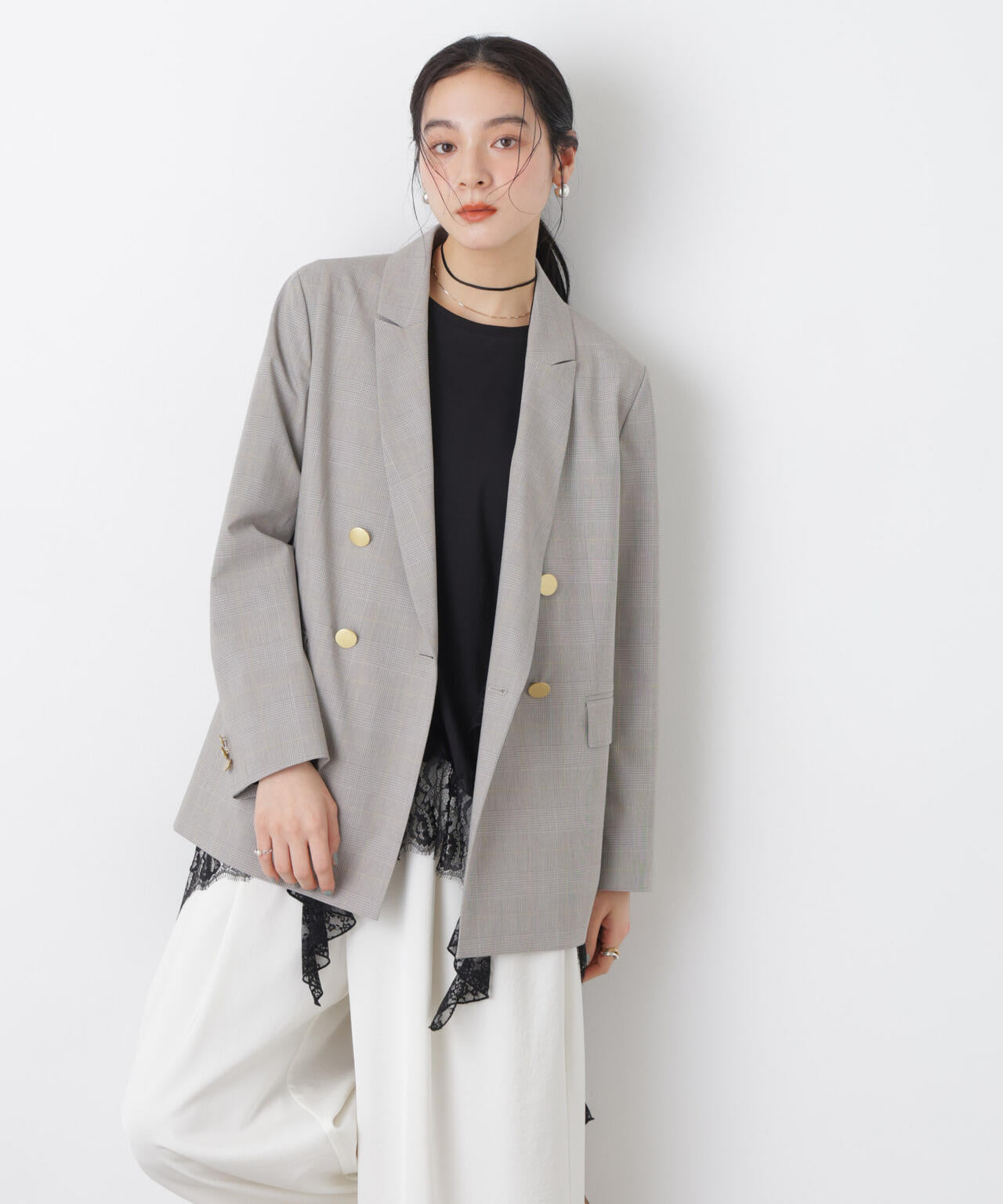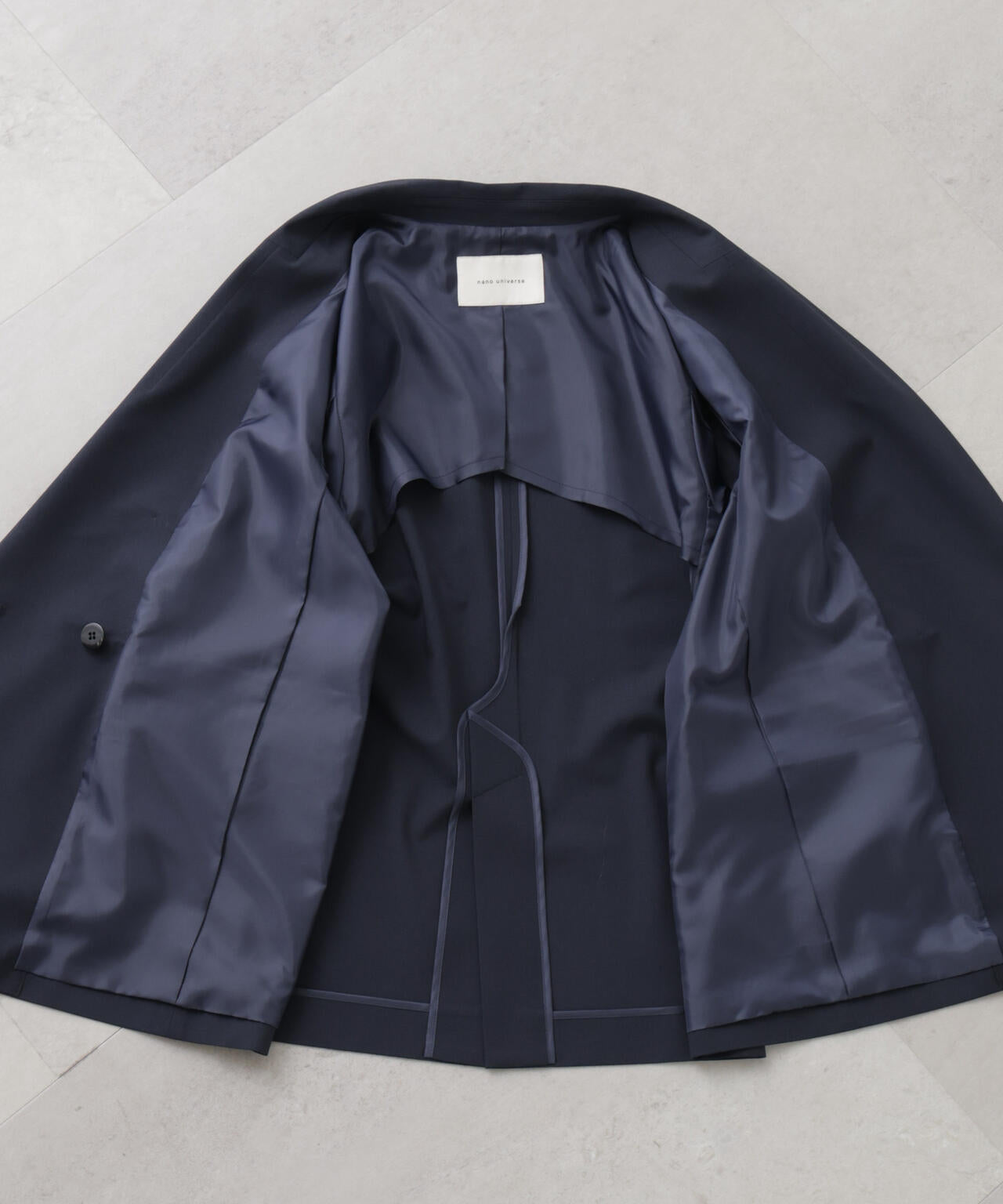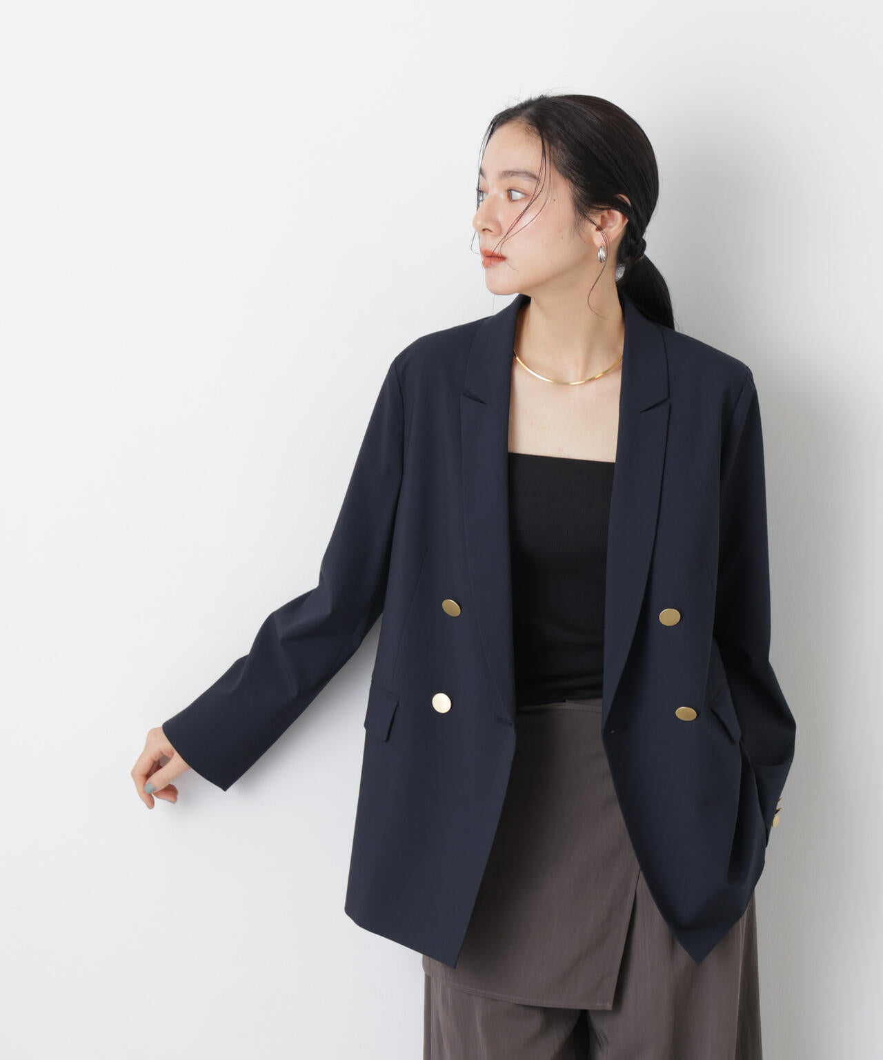 ストレッチの効いた抜群の着心地が魅力のダブルジャケット。金釦がアクセントのピークドラペルで、ボクシーなシルエットながら素材の軽さと落ち感で女性らしさもプラス。丈はやや長めで、パンツだけでなくスカートやワンピースともバランスよくコーディネートできます。