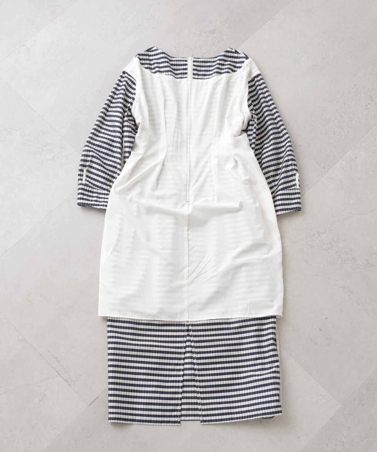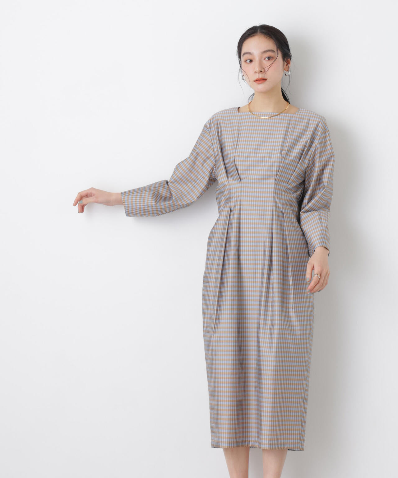 繊細な表現のチェック柄と、構築的なボトルラインのシルエットが特徴のワンピース。ボディはウエストをタックでシェイプさせ、コクーン型に作った袖のバランスがモードで今シーズンらしい一着です。
