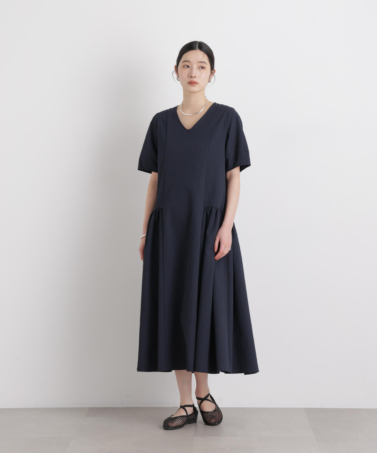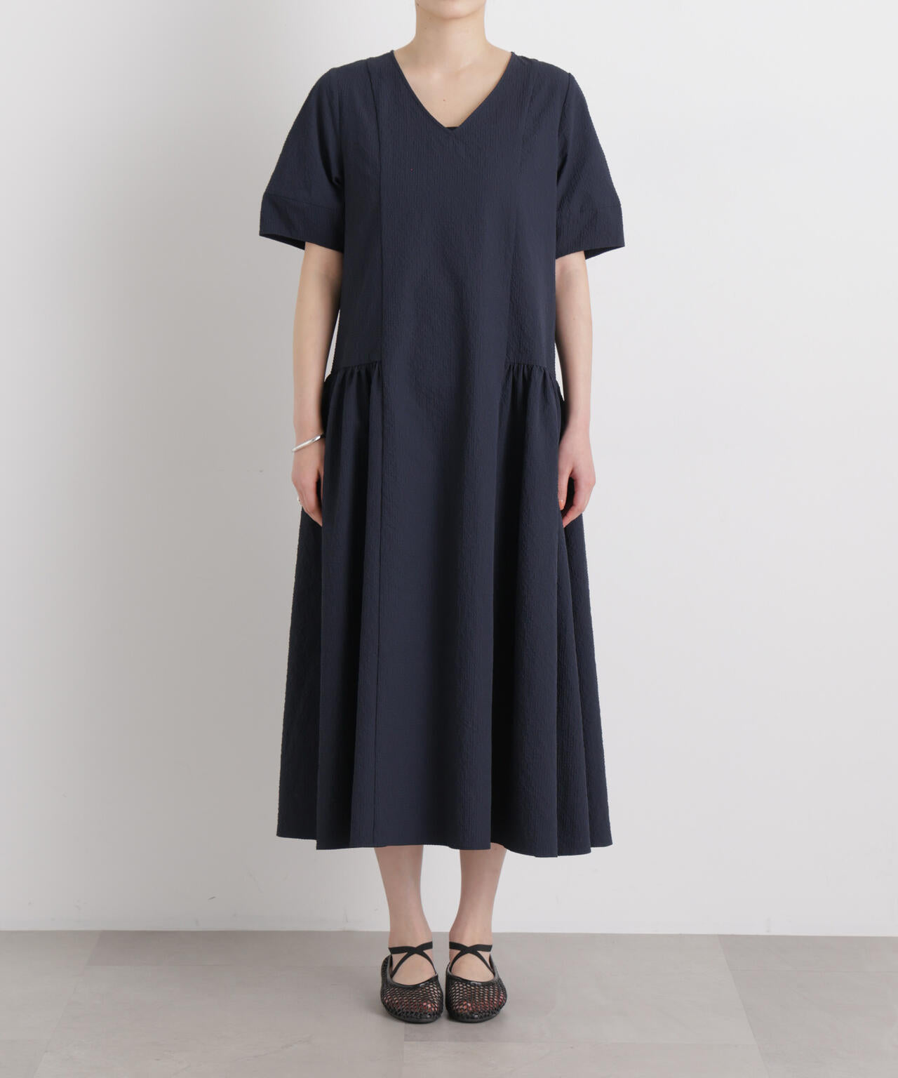 一枚でサマになるサッカー素材のワンピース。すっきりとしたVネックに、ローウエスト位置からギャザーが広がるシルエットが大人っぽさのある一着。ポコポコとした立体感が特徴のさらっとしたサッカー素材で、軽くて涼しい着心地も魅力です。