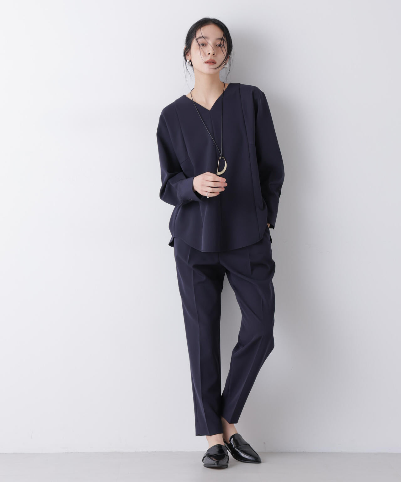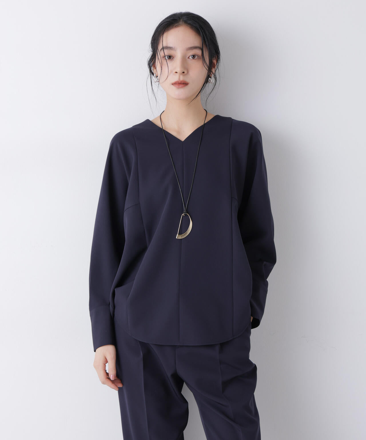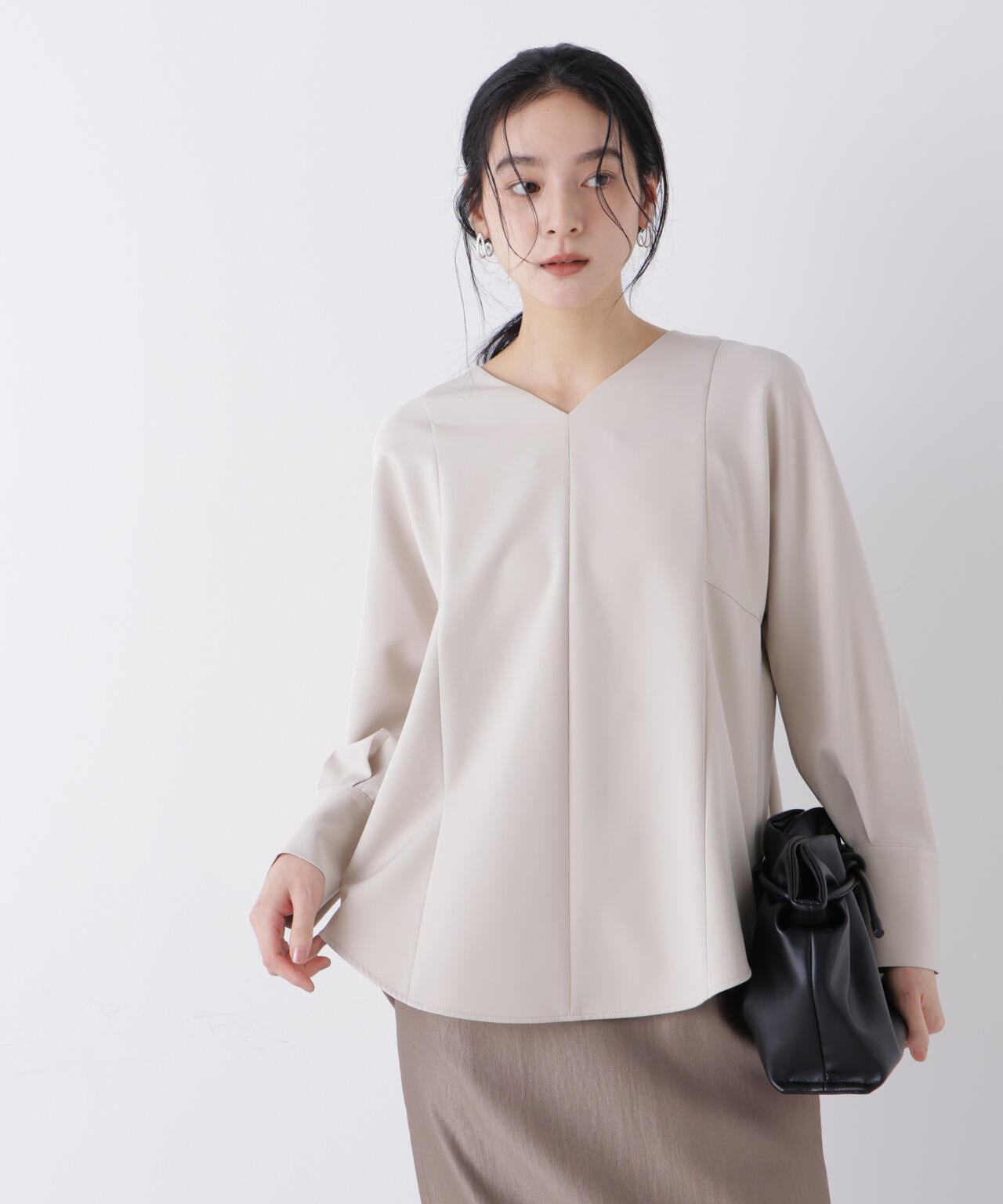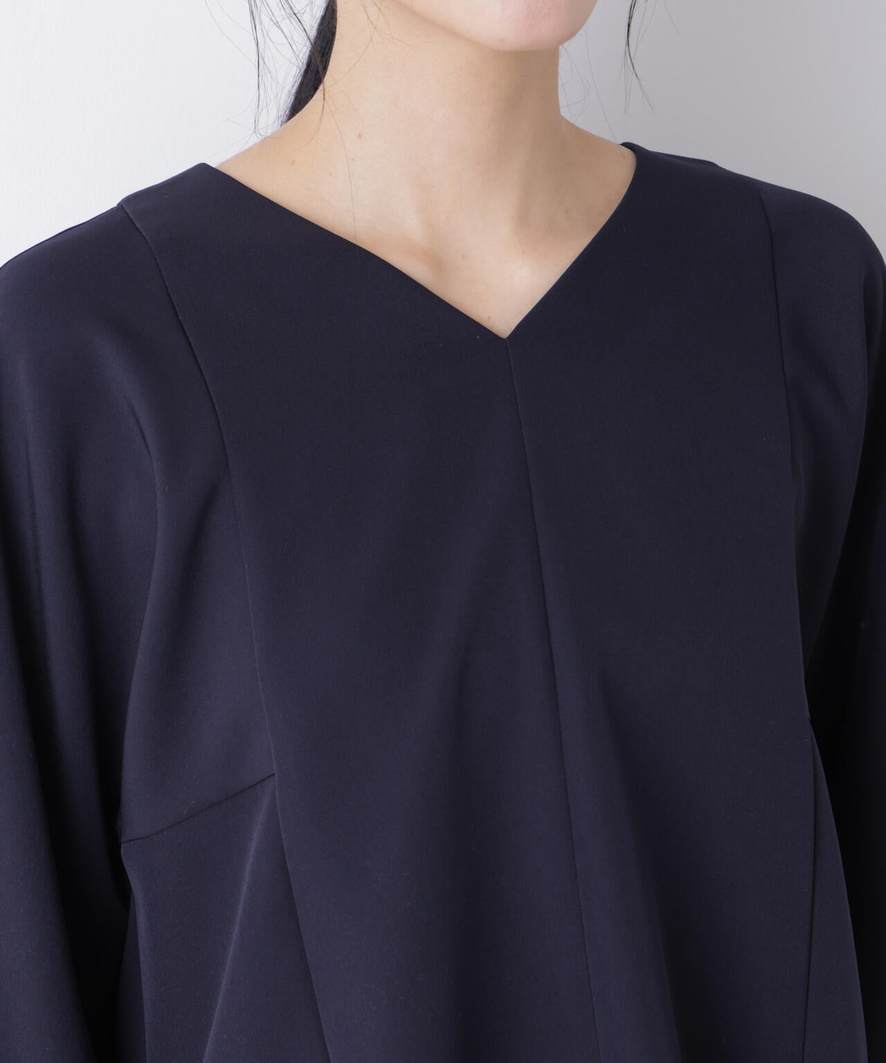 ・浅めVネックで鎖骨まわりを美しく見えるブラウス