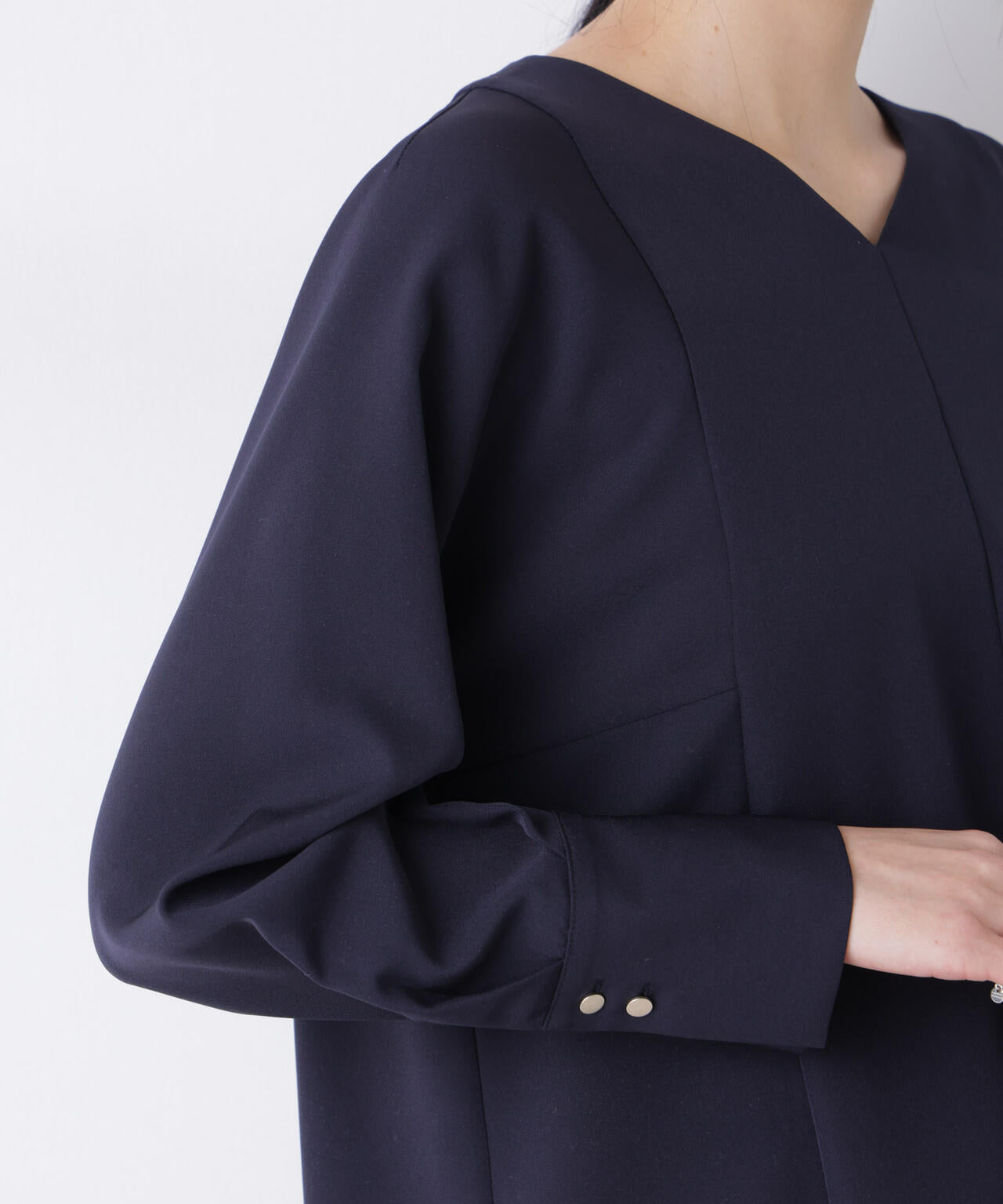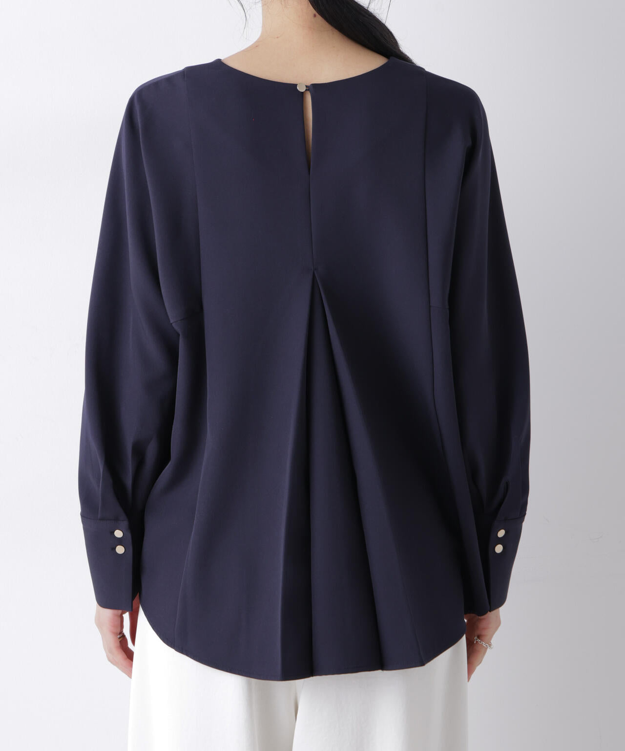 6つの便利な機能付きで、毎日活躍するブラウス。ソフトドルマン袖とロングカフスにあしらったゴールド釦で、上品なアクセント。長めの着丈でセットアップでも単品でもバランス良く着られる一着です。