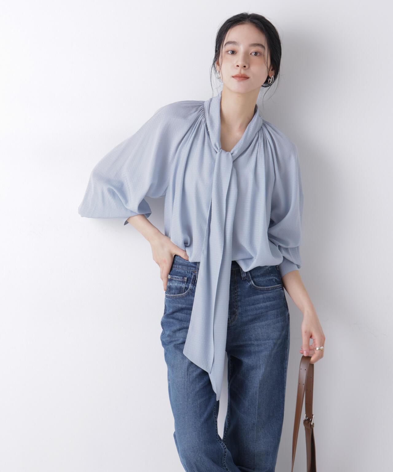 さりげないドビードット柄をあしらったリボンタイブラウス。衿ぐりと袖口にはたっぷりとギャザーをとり女性らしいデザインに。オケージョンからデイリーまでONOFFで活躍します。