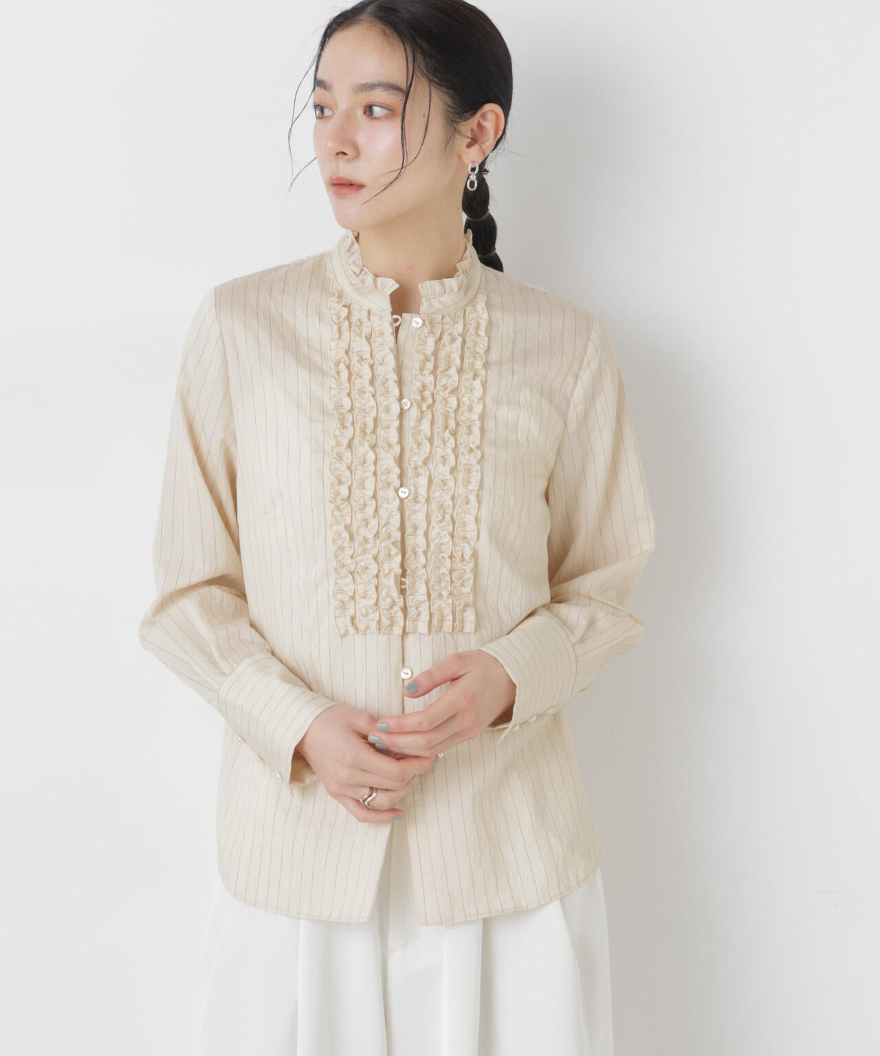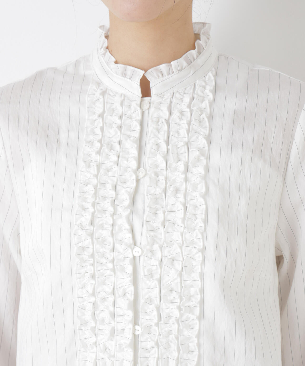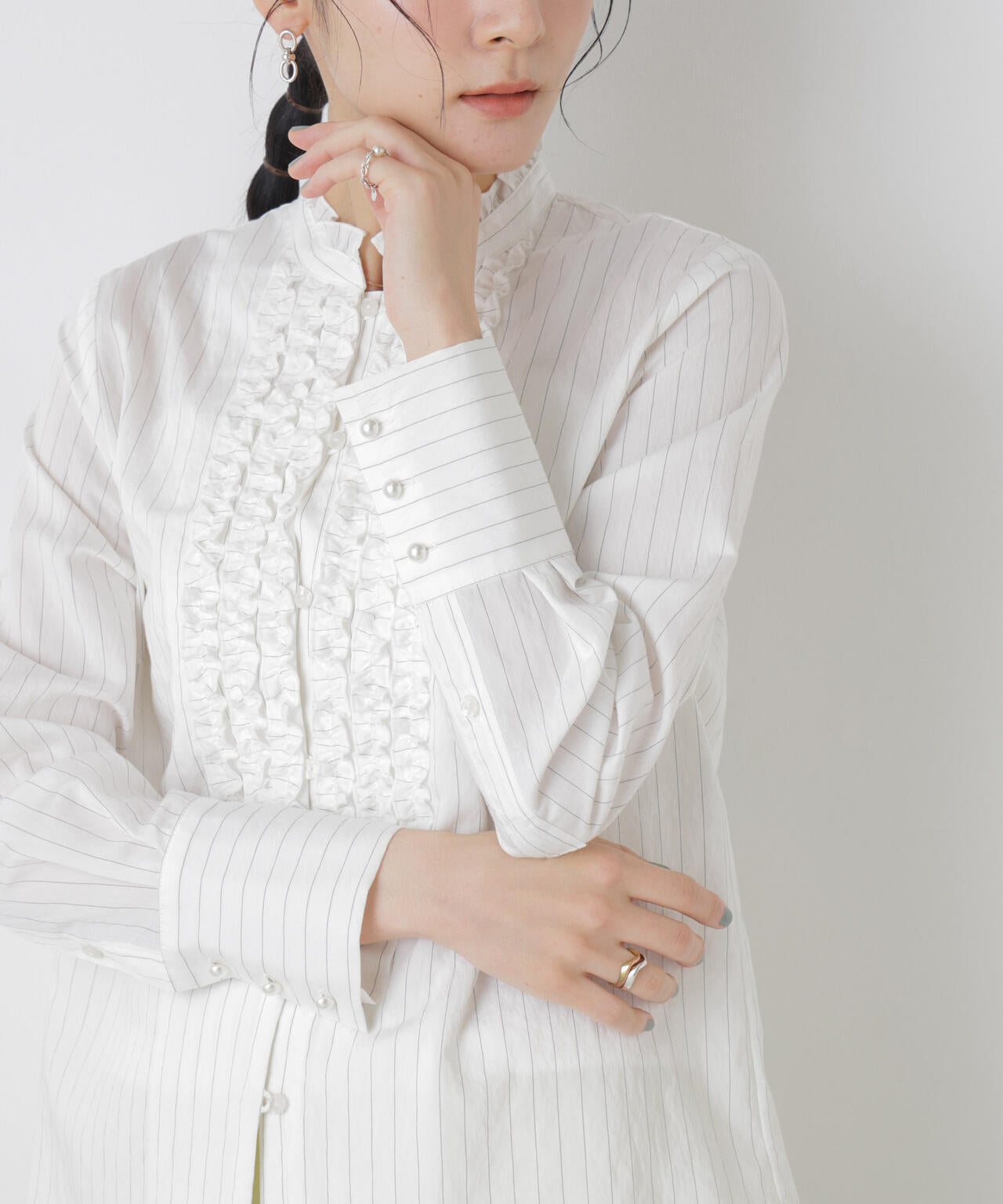 フロントにフリルディテールをあしらった華やかなブラウス。シャツ型をベースにした甘さ控えめのデザインがきれいめにもカジュアルにも合わせやすく、ON/OFFで着回せる万能アイテムです。