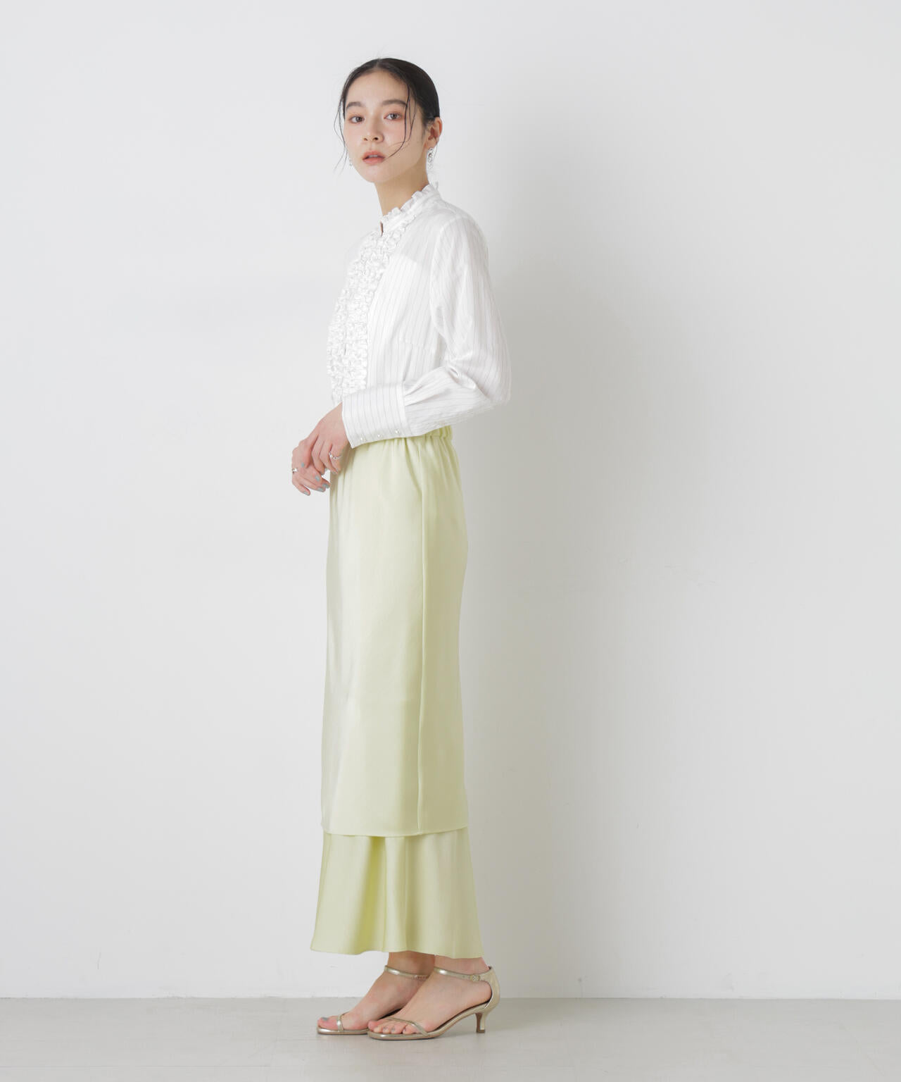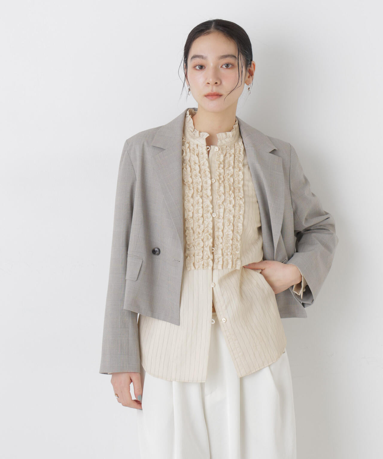 ・襟元の細めのフリルがレイヤードした際にも華やかさをプラス