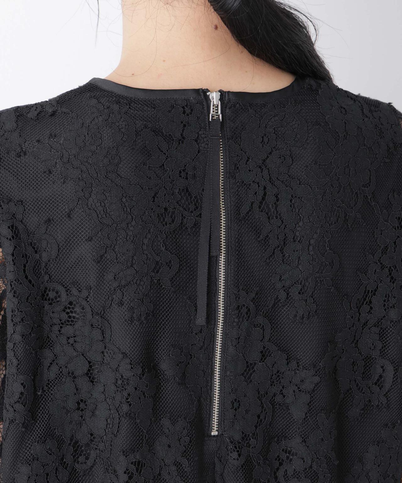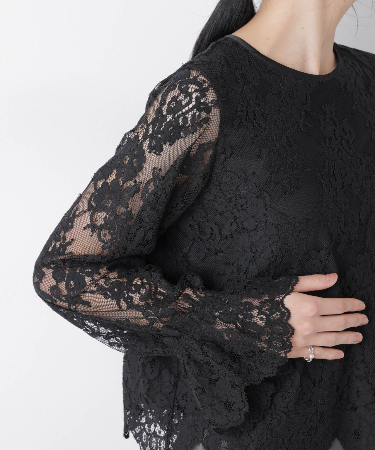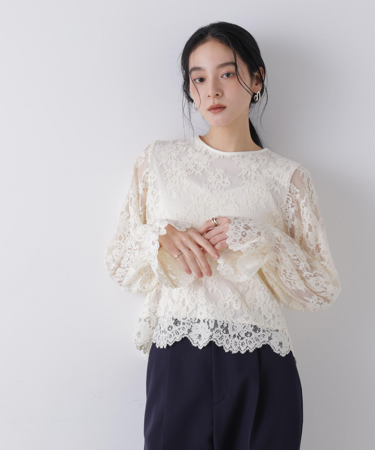 繊細なコードラッセルレースを贅沢に使用した総レースブラウス。裾と袖口はレースのスカラップを生かした断ち切り仕様で、華やかさの中に抜け感をプラスしたディテールも素敵です。