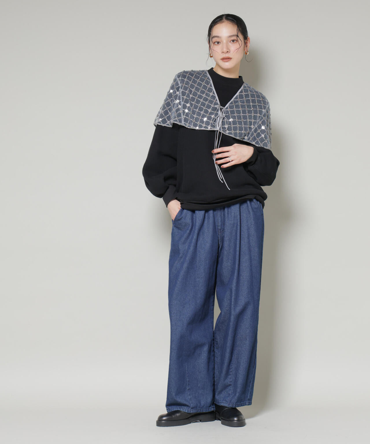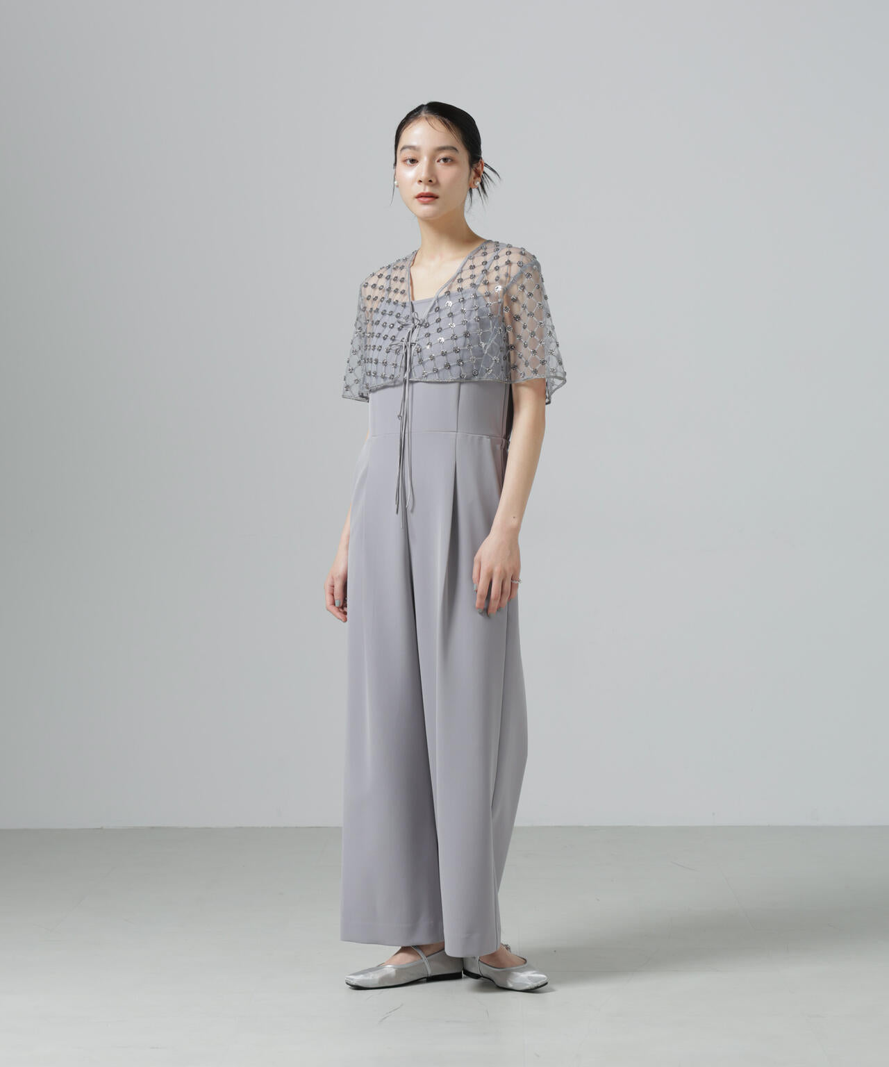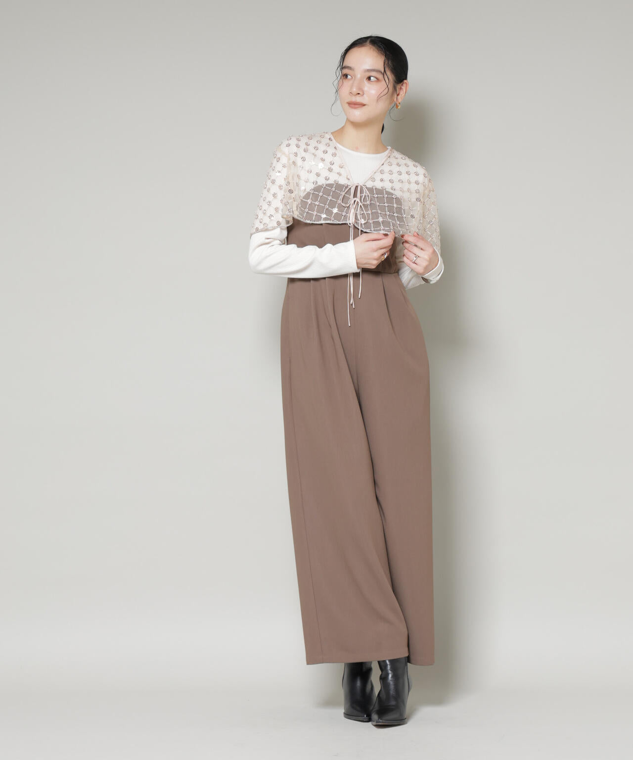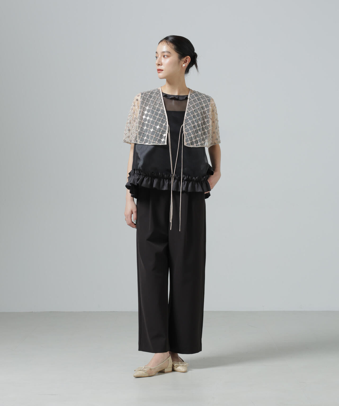 装飾的なスパンコール生地がコーディネートのポイントになる刺繍ケープボレロ