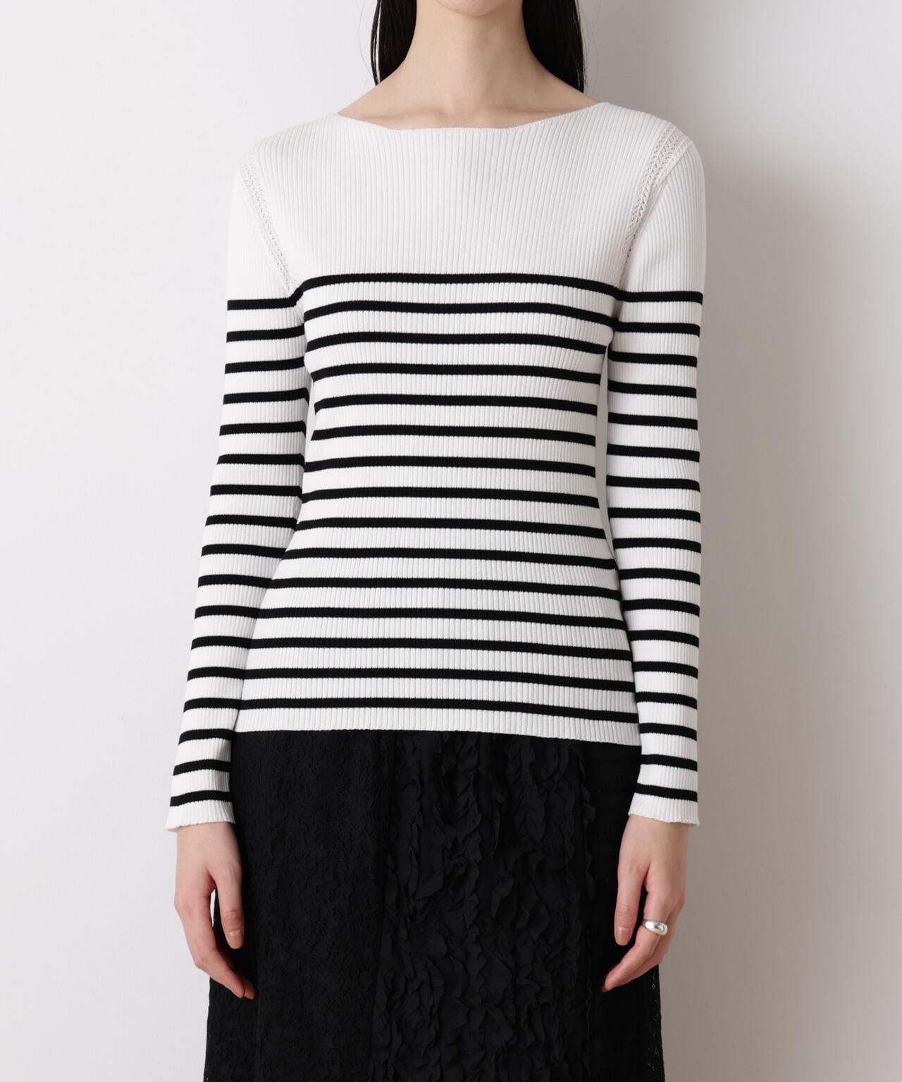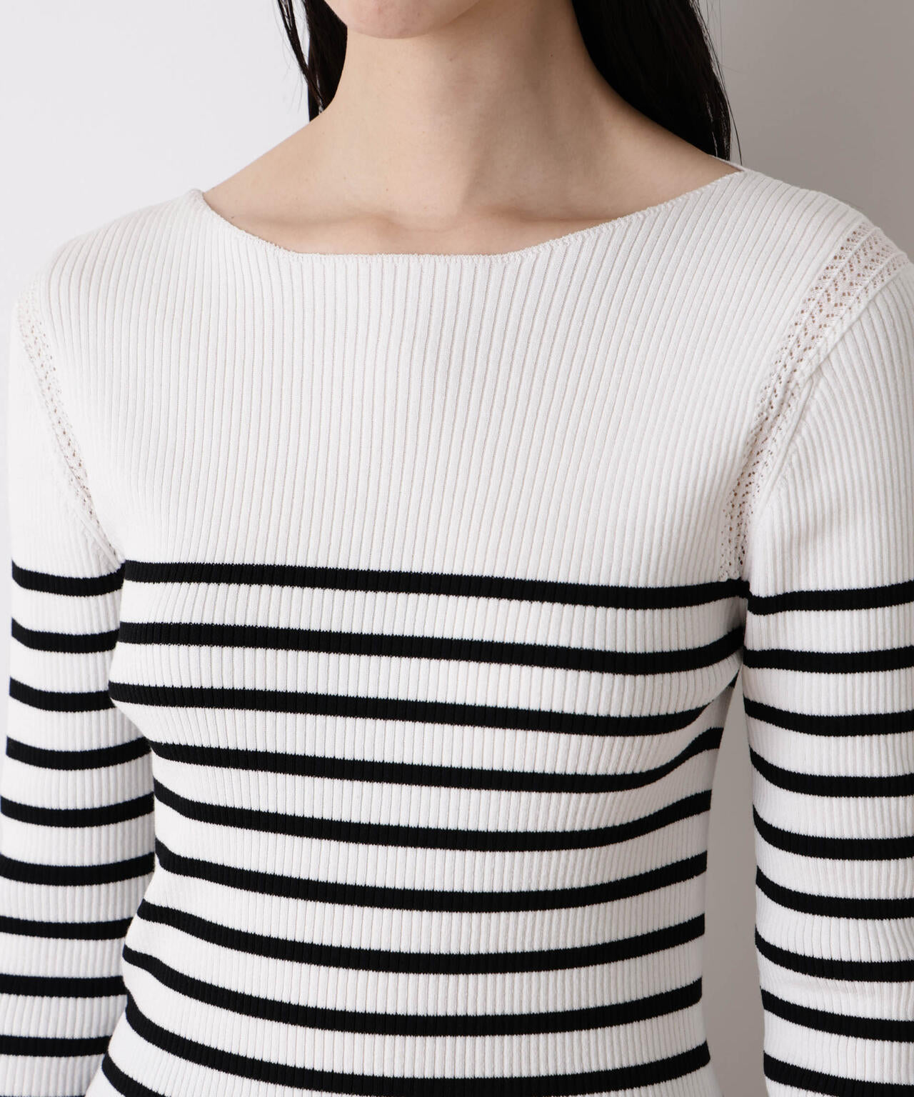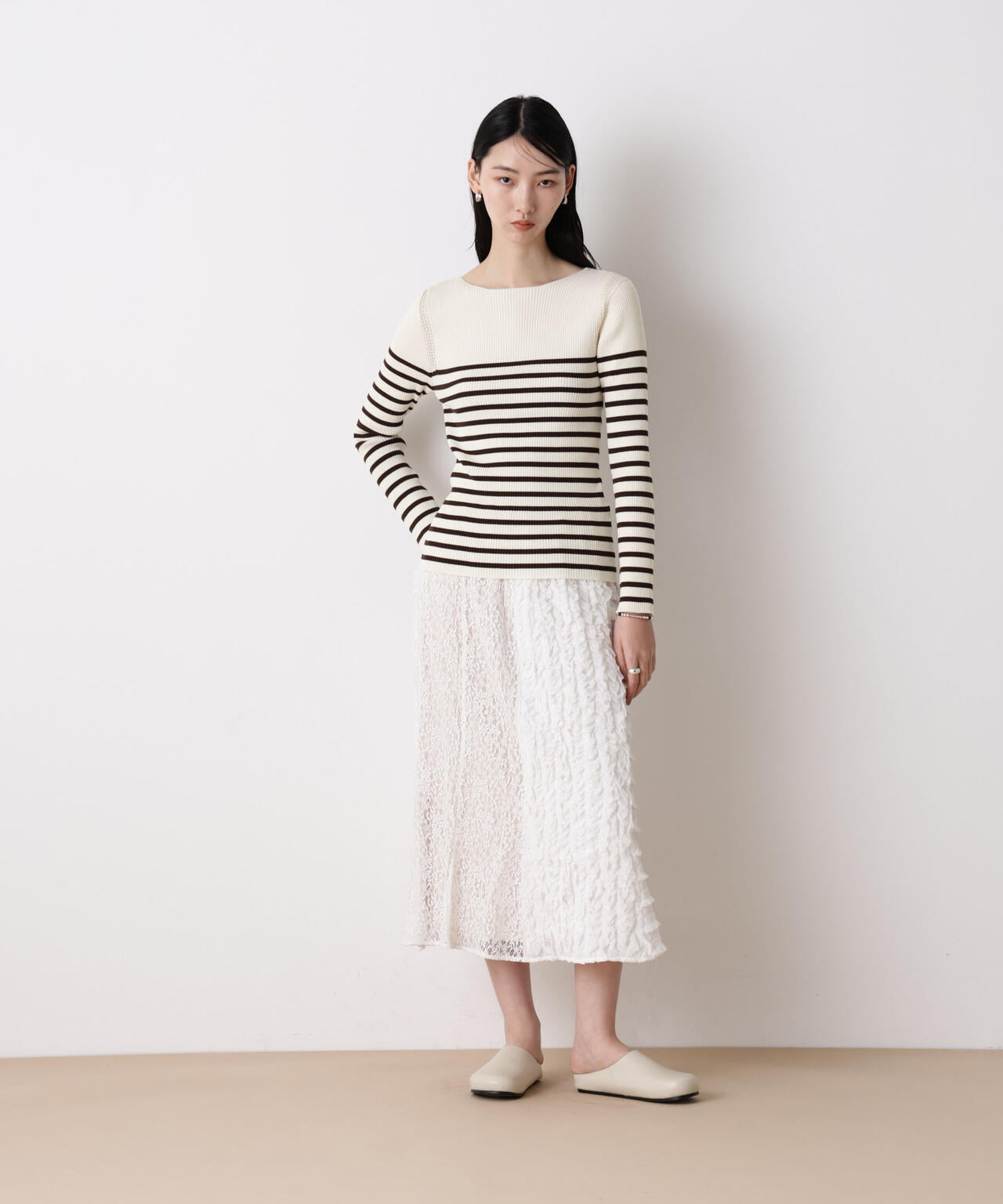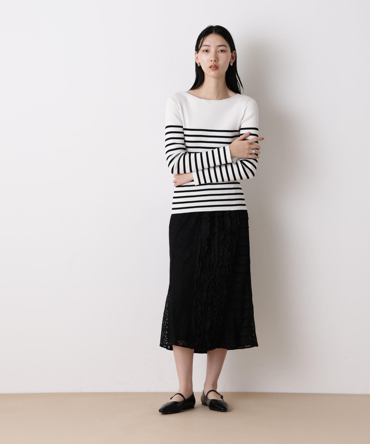 シンプルなボーダーピッチにレース編みを施し、フェミニンに仕上げたニット