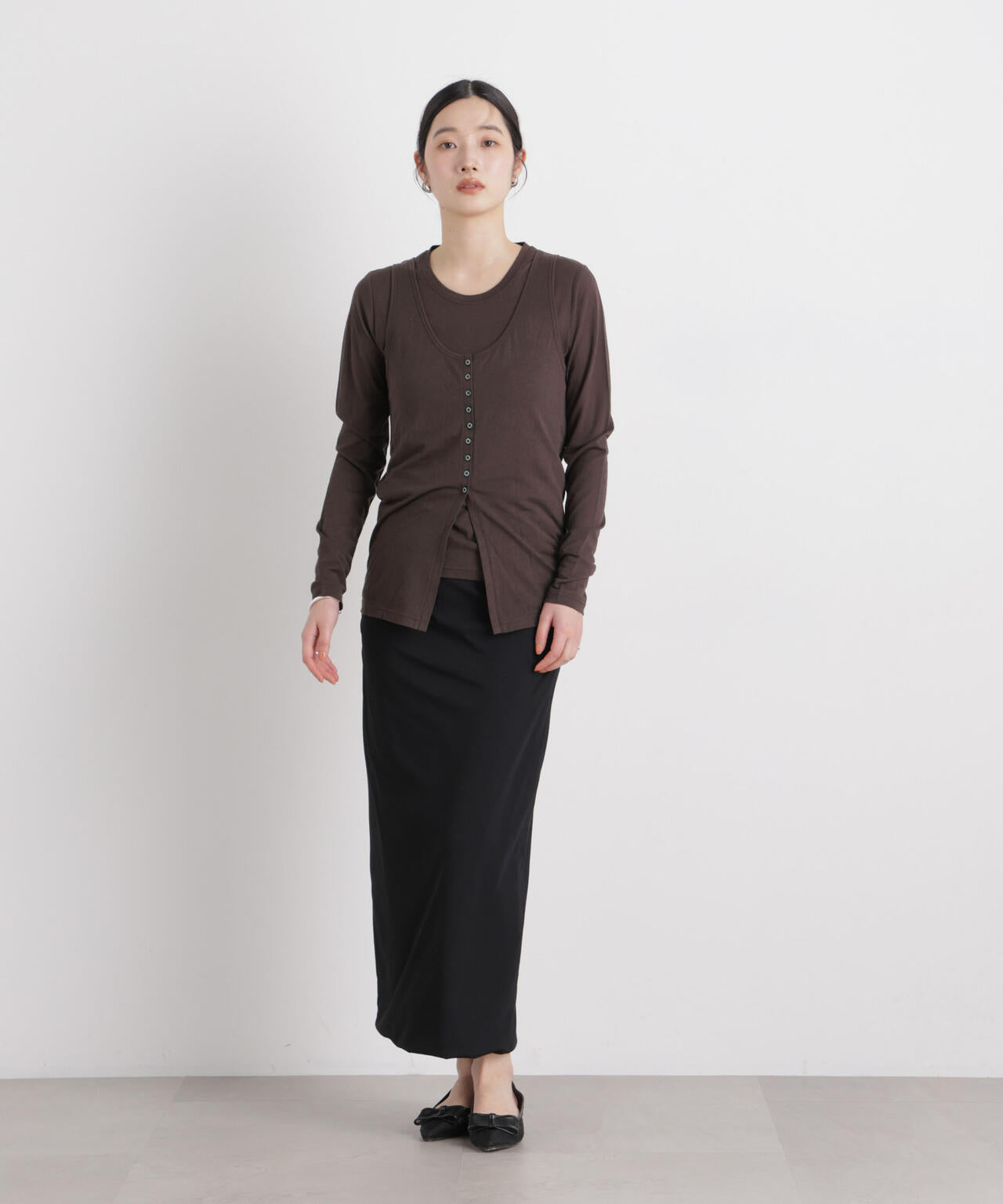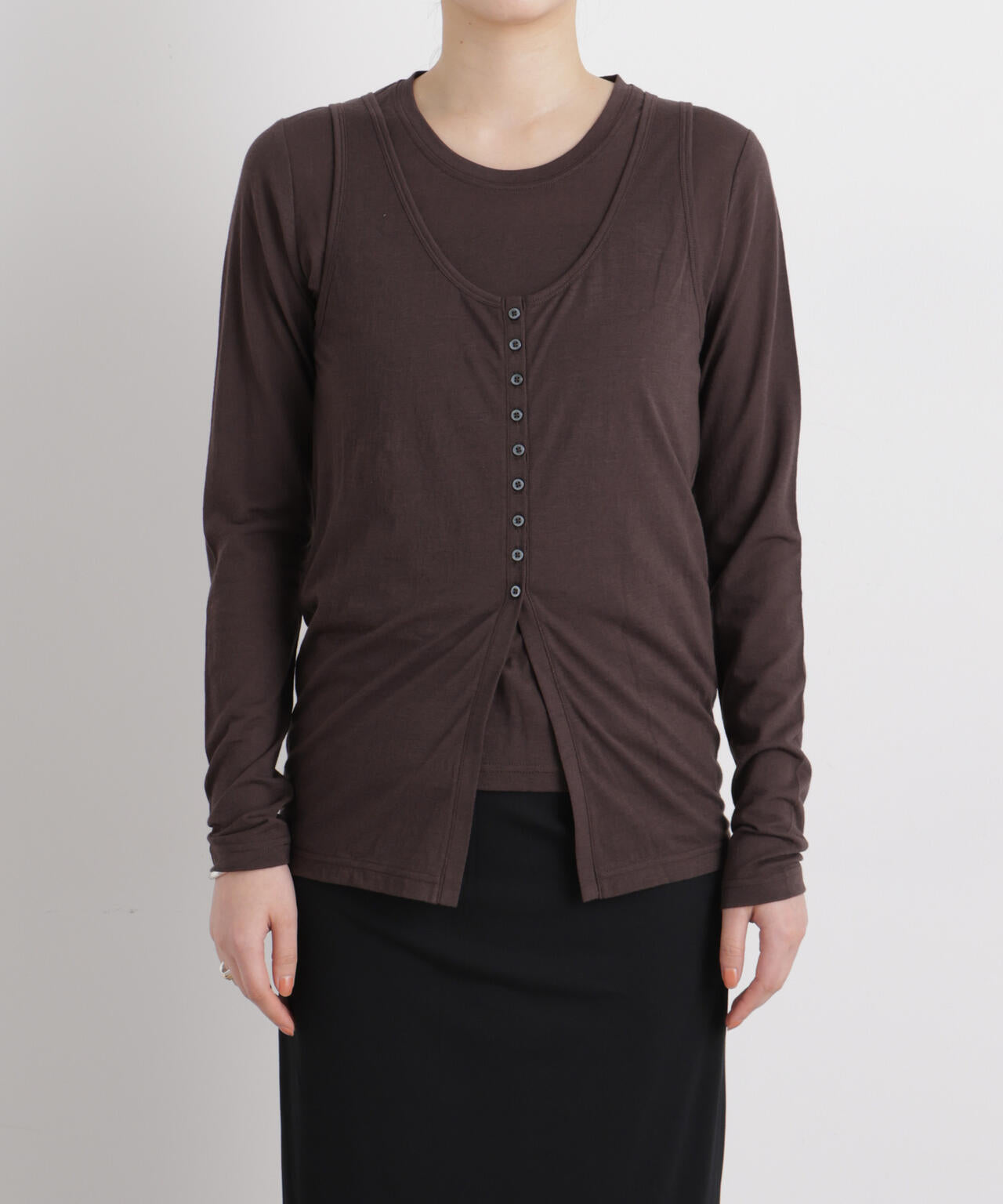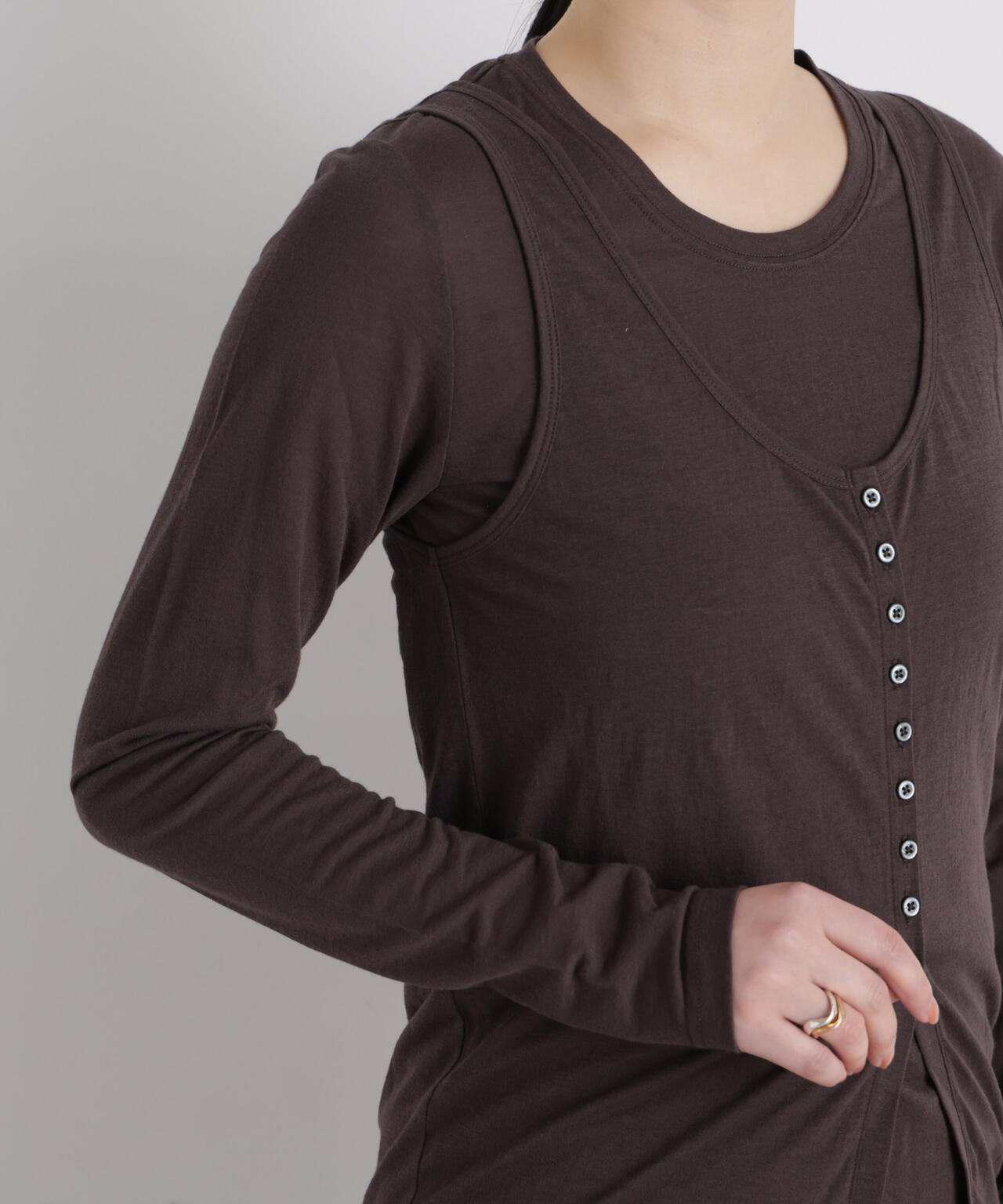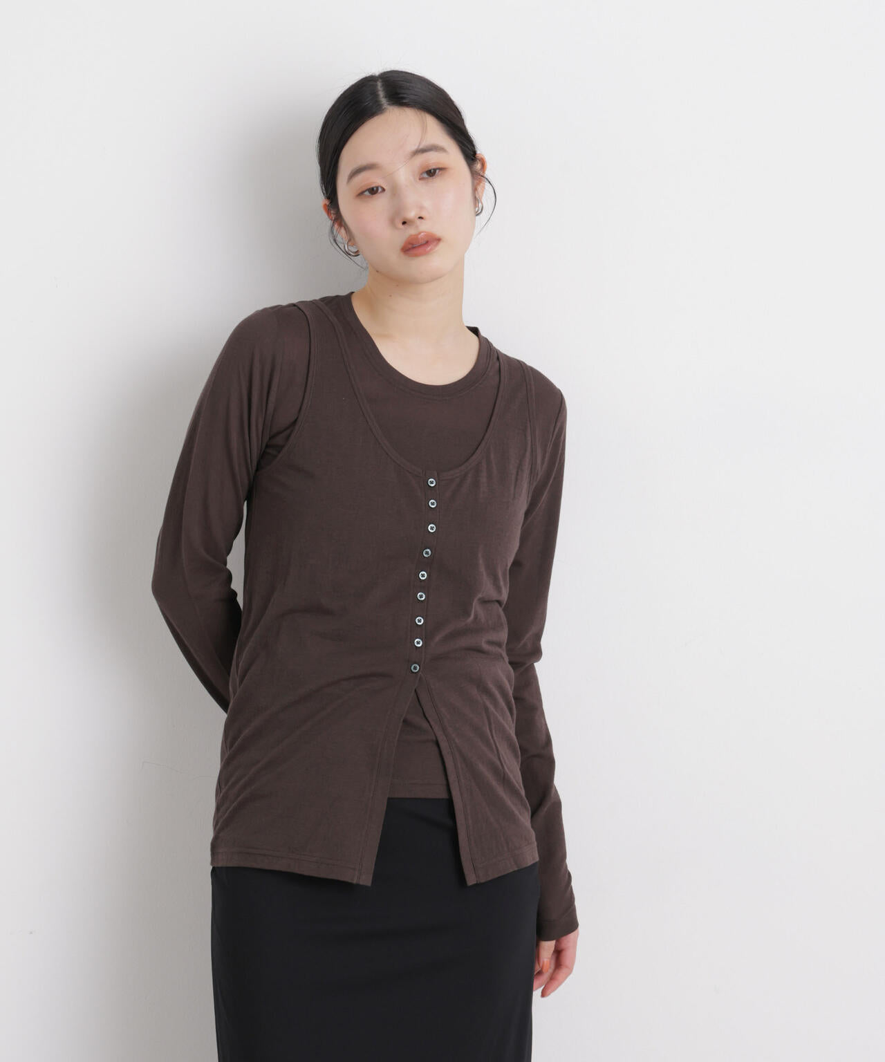 繊細な透け感の天竺生地を使用した、ロンTとタンクトップの同素材セットアイテム。タンクトップはウエストより下には釦を付けていないため、着用時は自然に開き、長めのスリットのような表情に。セットでもそれぞれ単品でも着回しやすく、季節を通してスタイリングの幅を広げてくれる万能アイテムです。