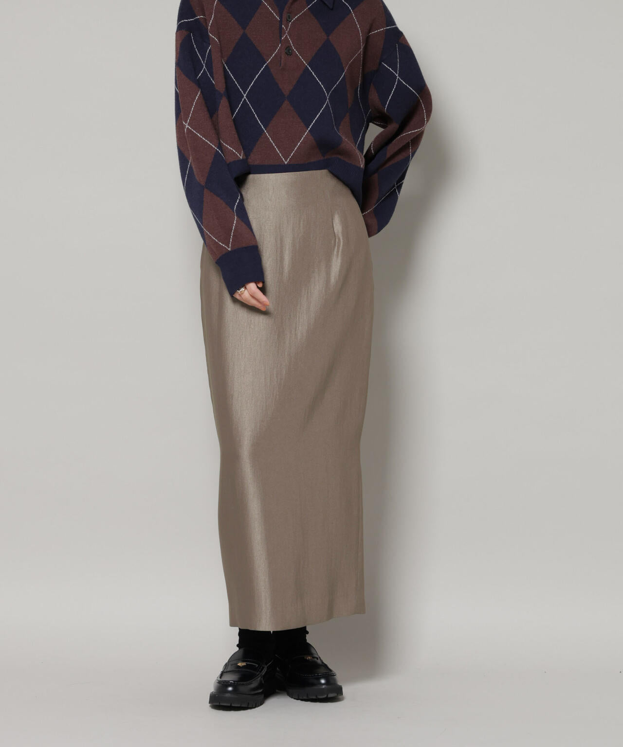 ・女性らしいスタイリングに仕上がる光沢素材のスカート