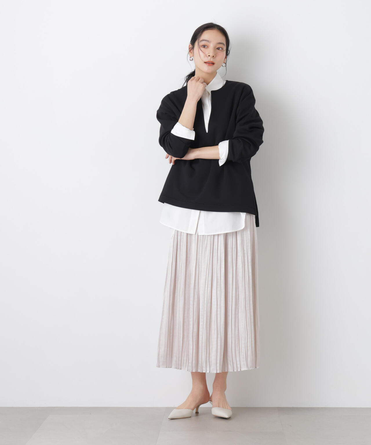 光沢感のあるサテン素材で仕立てた女性らしいプリーツスカート。きれいめな素材感なのでオフィスやオケージョンにはもちろん、あえてカジュアルなトップスに合わせて女性らしさをプラスするミックススタイルも素敵です。
