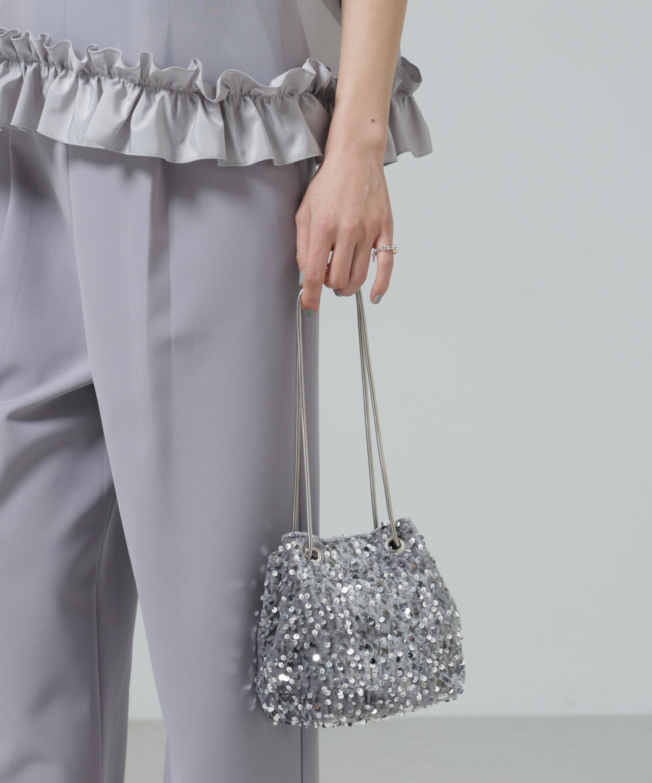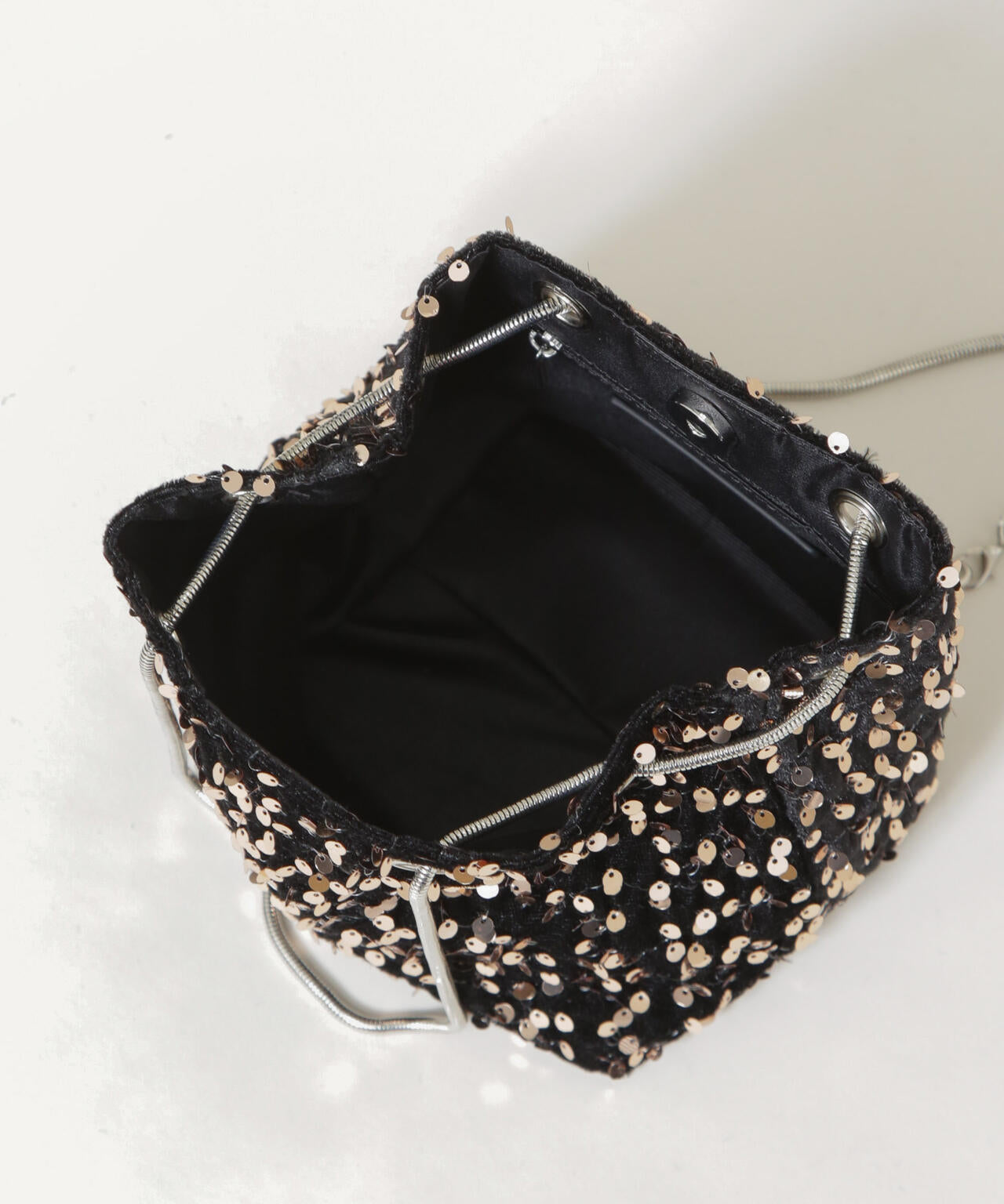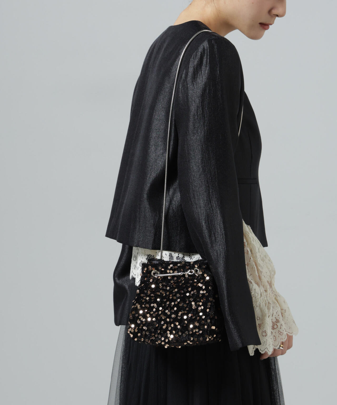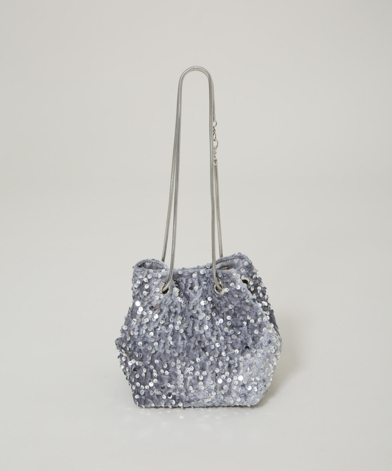 セレモニーやパーティーシーンに重宝する華やかなデザインの巾着バッグ。柔らかく上品な光沢をもつベロアの表面に細かなスパンコールをあしらい、動くたびにキラキラと繊細に輝くデザインが魅力。オケージョンからデイリーまで、スタイリングのアクセントに映える一品です。