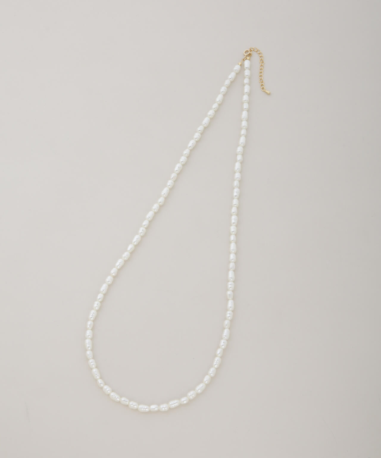 上品さと程よい華やかさを兼ね備えたパールネックレス。パール特有の凹凸感が一粒一粒に表情を与え、かしこまりすぎない柔らかな印象を演出。軽やかなフェイクパール素材で、長時間の着用でも快適にお使いいただけるアイテムです。