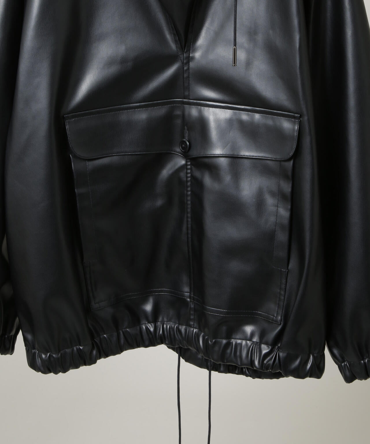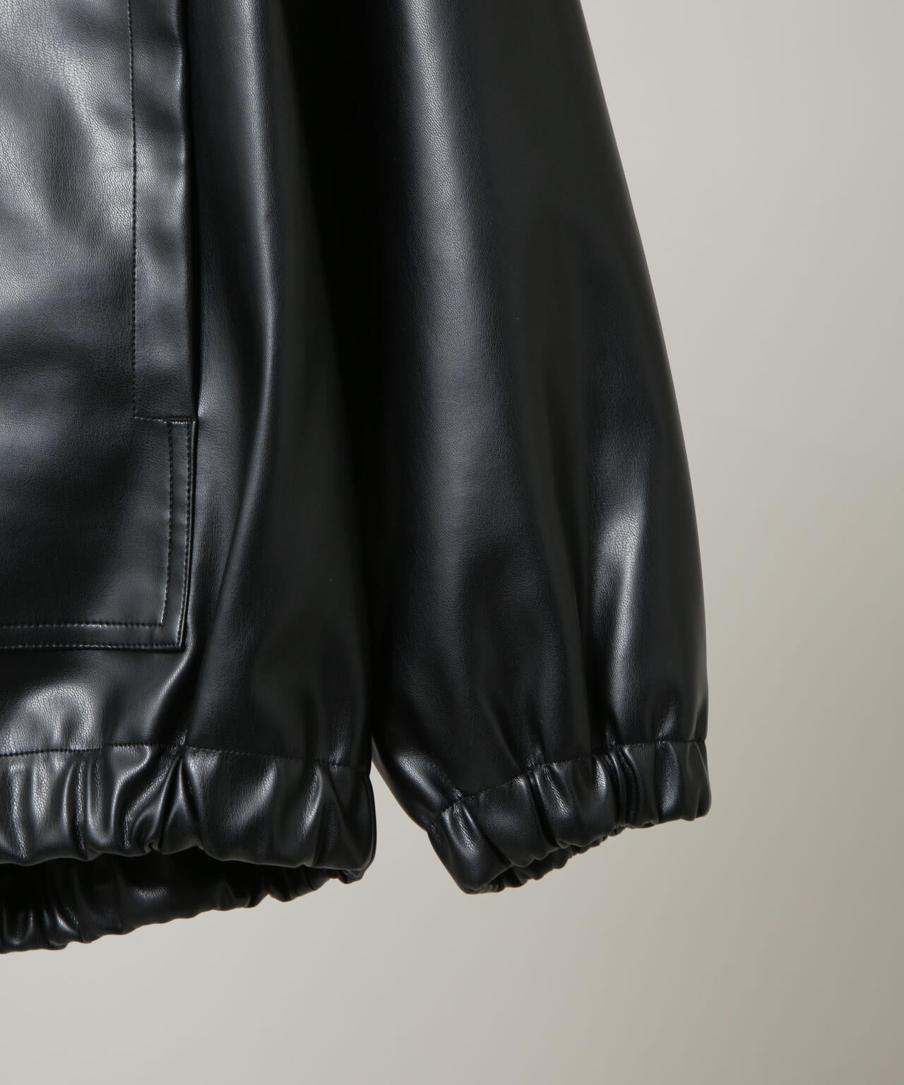 弾力性と光沢感が特徴のエコレザーを使用した、アノラックブルゾン。身頃から袖下にかけての大きなマチのついたラグランが特徴の1着。