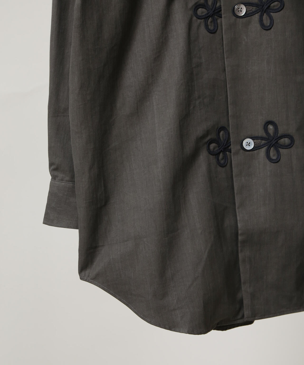 テープの装飾をあしらったアシンメトリーな前立てが特徴のスタンドカラーシャツ。タックインでもアウトでも様になるバランスの良いシルエットの1着。