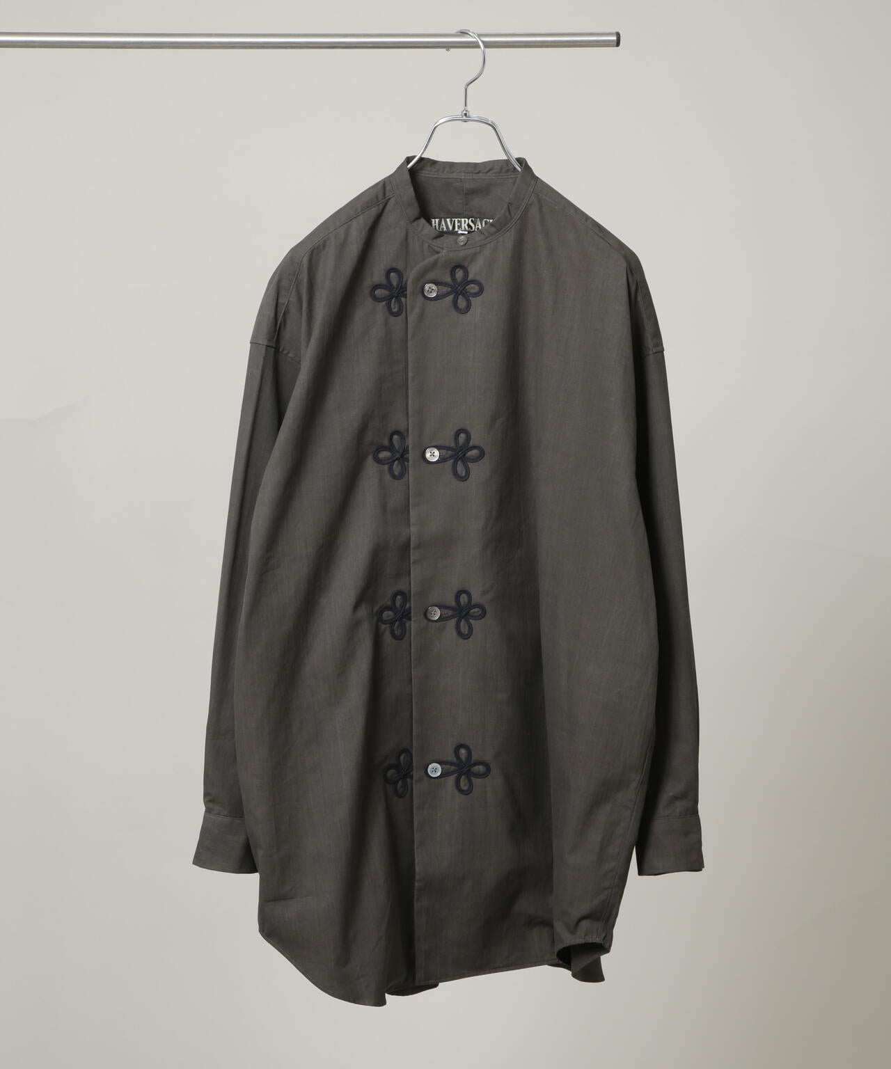 アシンメトリーな前立てが特徴のスタンドカラーシャツ
