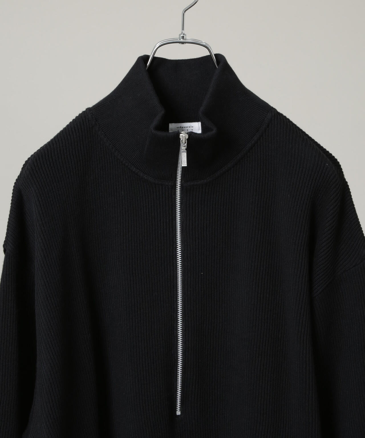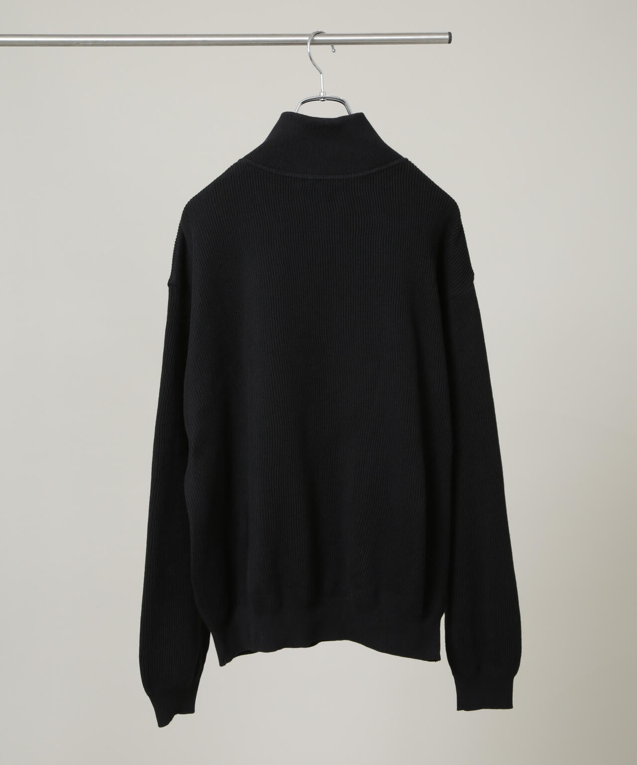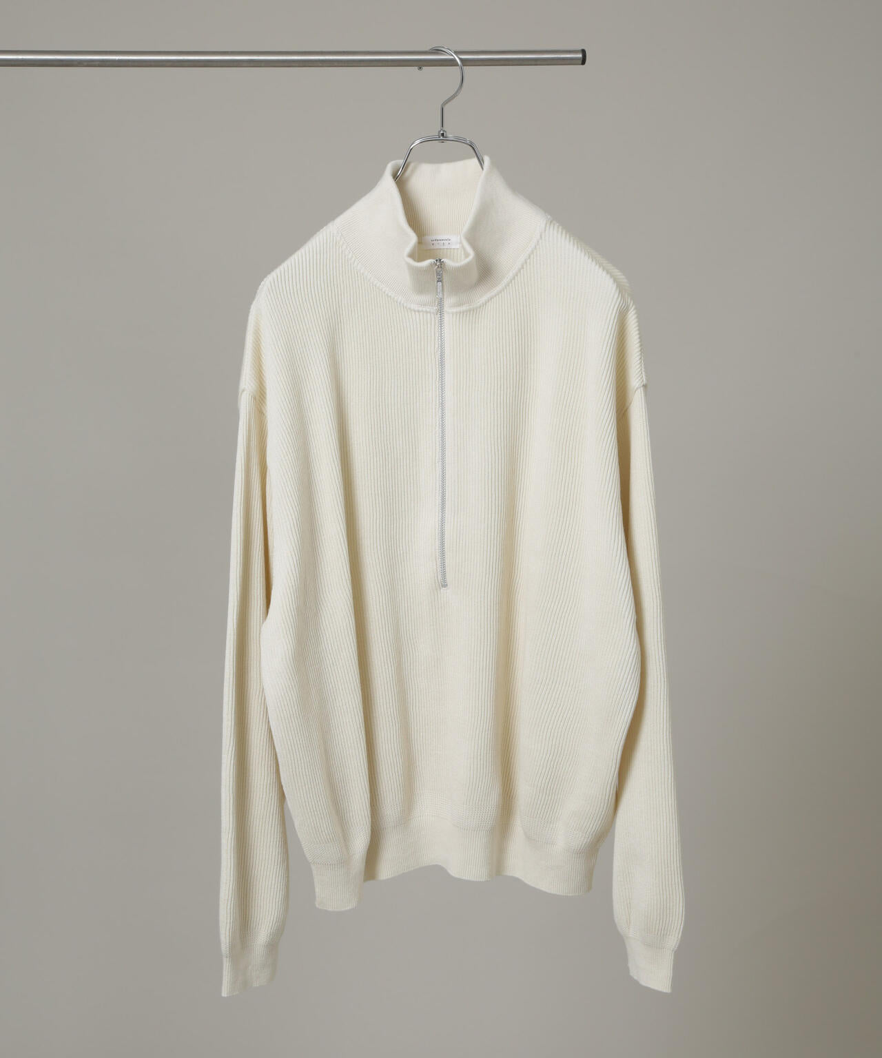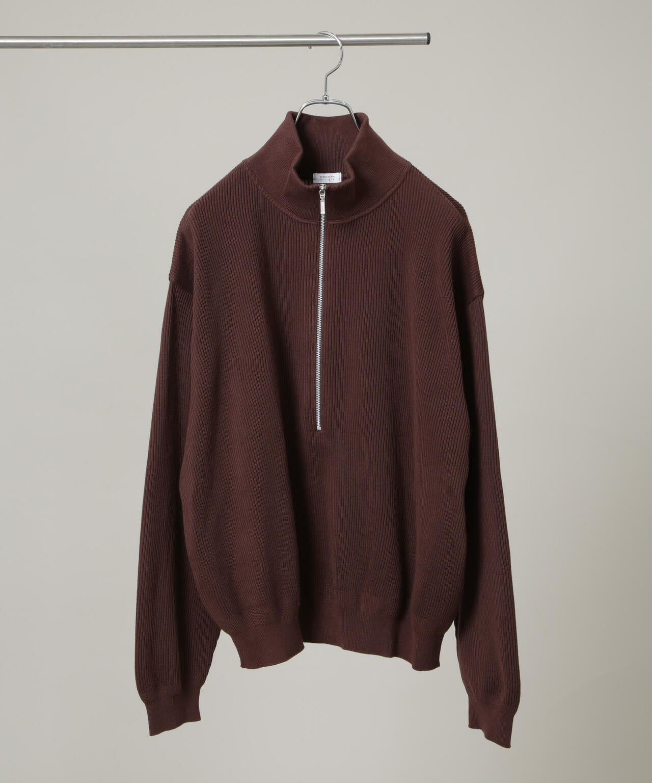 ハーフジップデザインに、ドライバーズニットをミックスさせたようなディティールがポイントの別注ニット。スッキリとしたシルエットで上からジャケット等を羽織ることも可能な一着。大人のカジュアルスタイルに重宝するアイテムです。