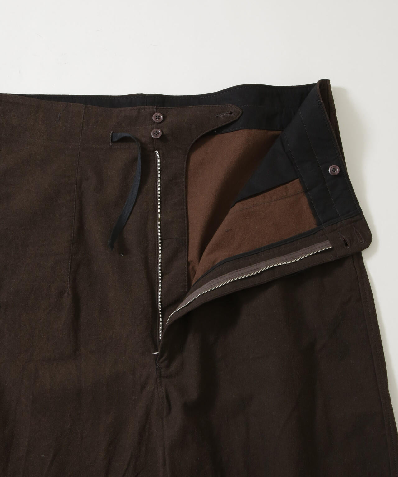 深い股上とクロップ丈のワイドシルエットが特徴のイージーパンツ。フロントファスナーはウォルディスファスナーを使用し、ヴィンテージ感のある仕上がりのアイテムです。