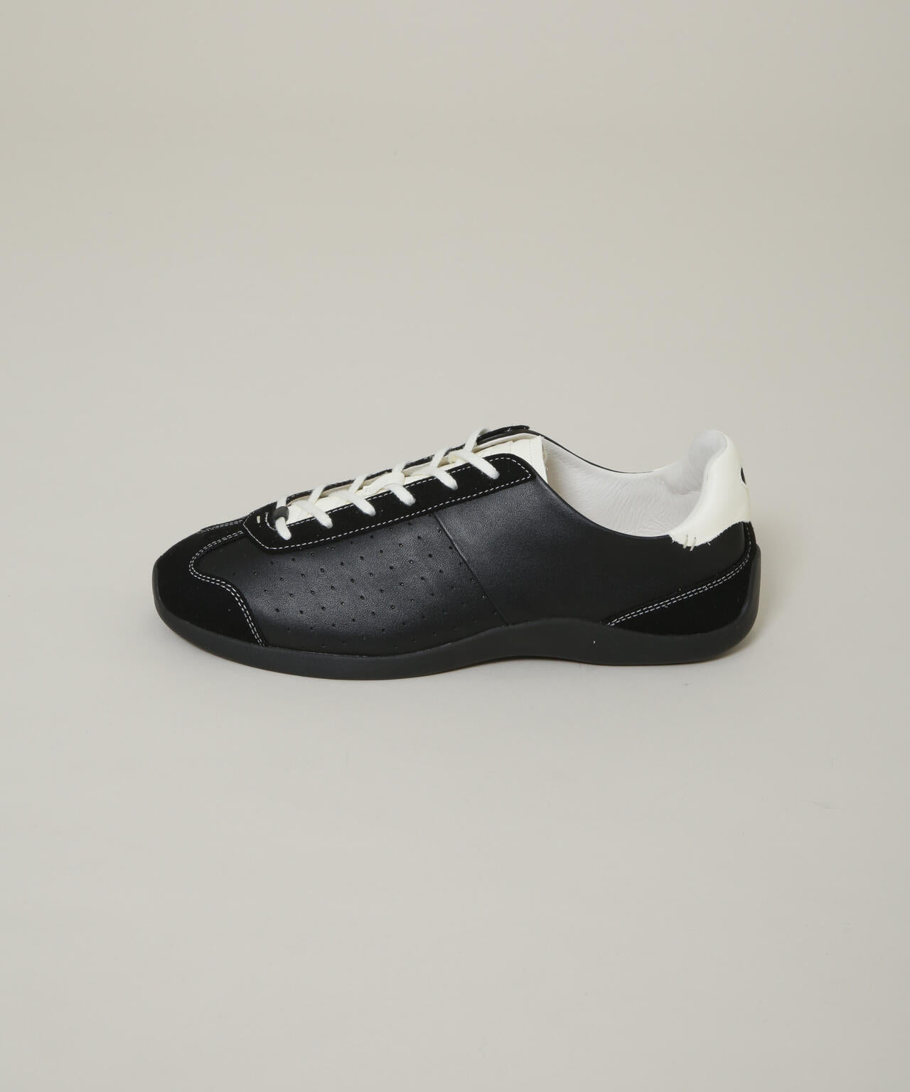 ブランドの定番トレーニングシューズのシルエットをベースに、ソールを薄くし、ライニングをなくすことで、レザーの履き心地をダイレクトに体感できるモデルを開発したBALLET GAT。アッパーには上質なレザーをメイン素材に選び、フロント部分には薄型ソールにマッチするパンチング加工を施した、洗練されたシルエットを実現した一足です。