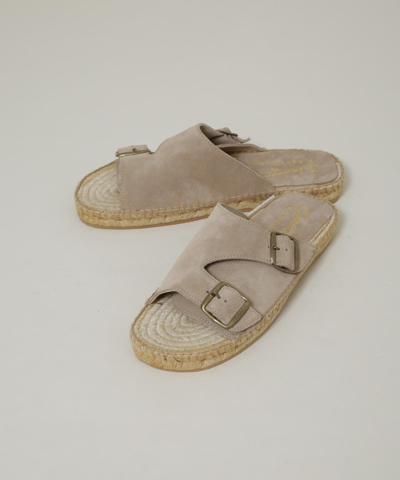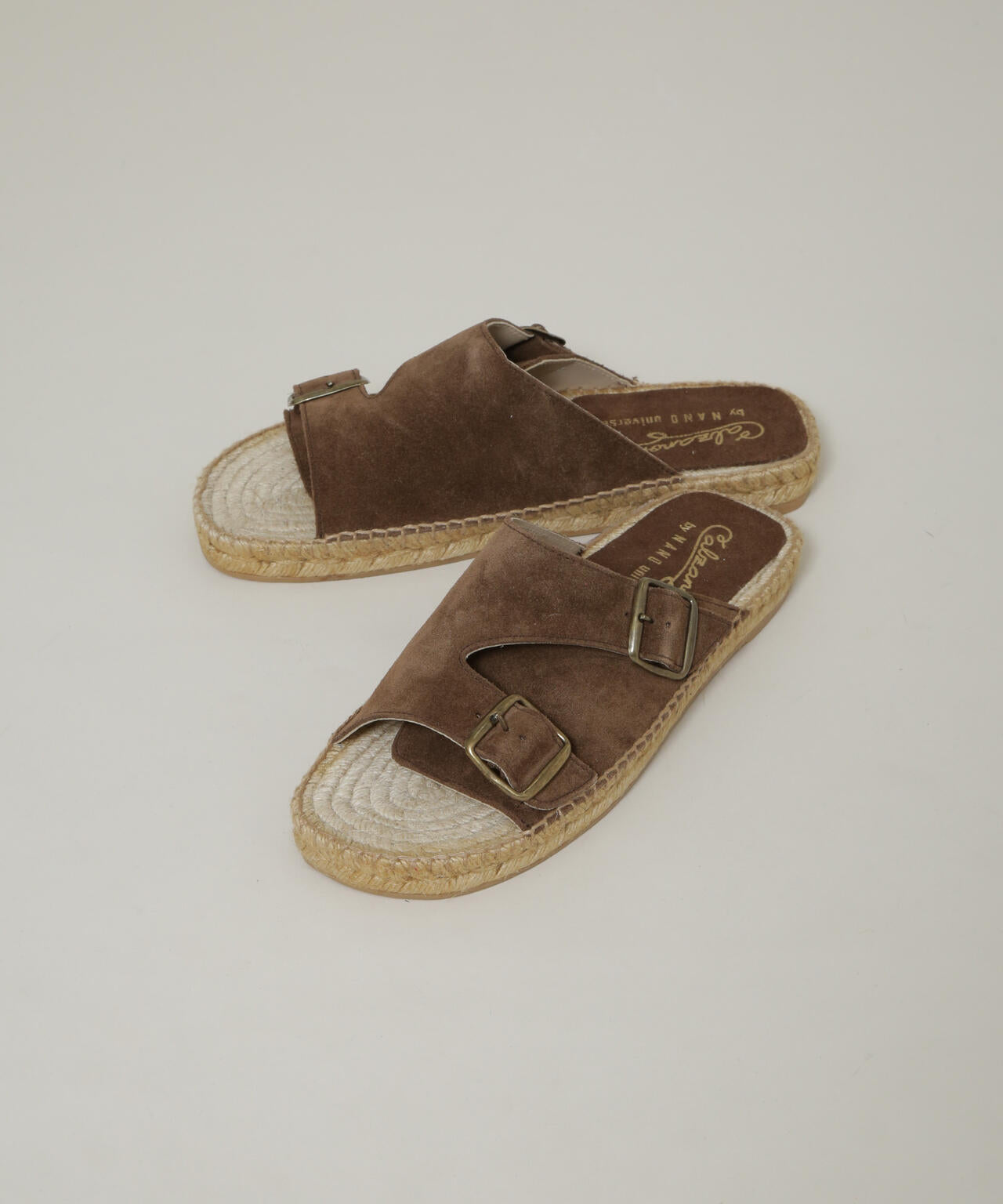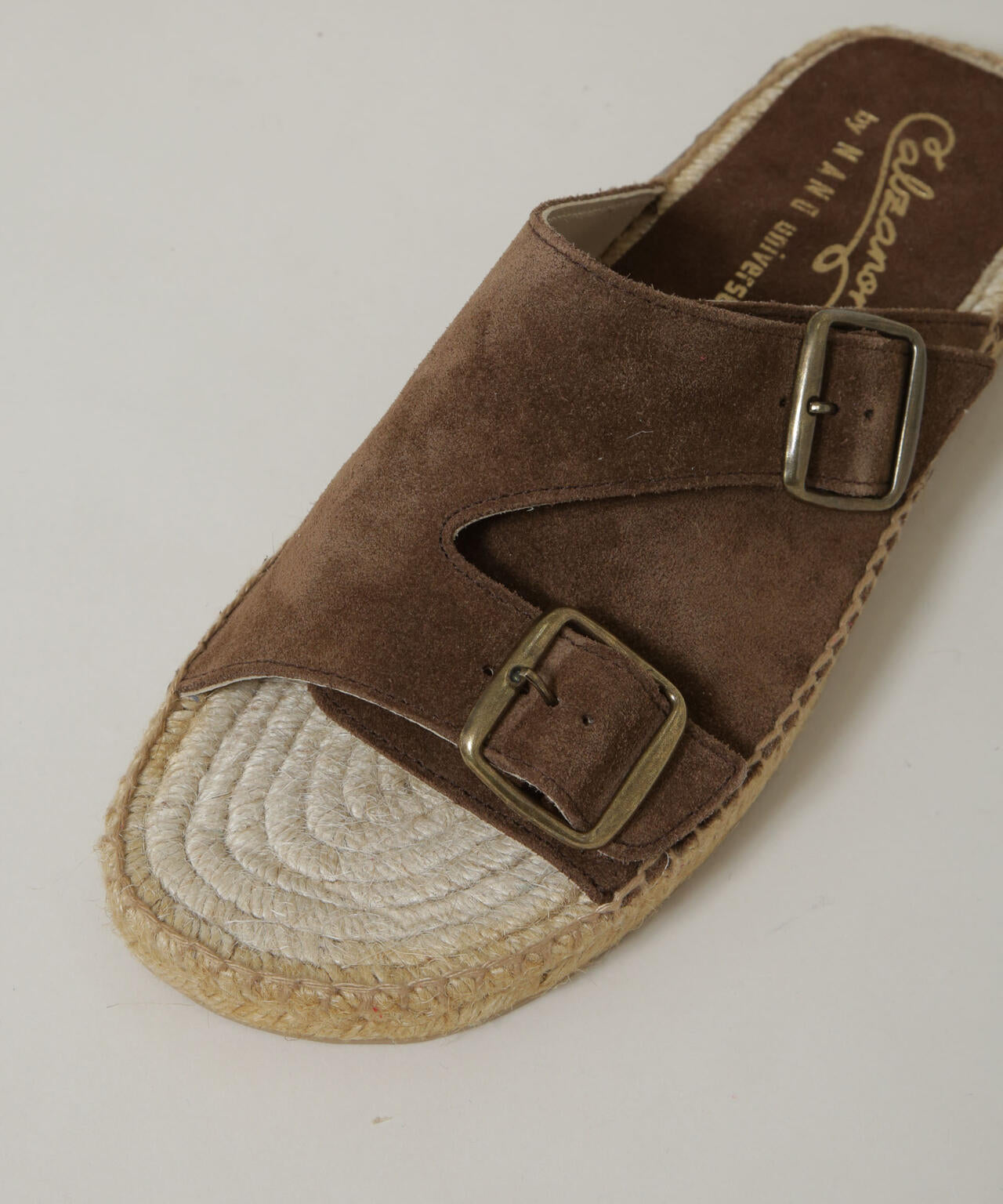calzanor別注のスエードサンダル。スペインの自社工場にてソールからアッパーまで一貫生産しているカルザノール。ジュート麻を丁寧に編み込んだソールを足型に合わせて形成し、アウトソールのラバーと熱着し耐久性と軽さを両立。さらにソールとアッパーは職人によるハンドステッチで縫い合わせられており、グリップ力に優れた快適な履き心地を実現。軽やかで歩きやすく、デイリーに活躍する一足です。