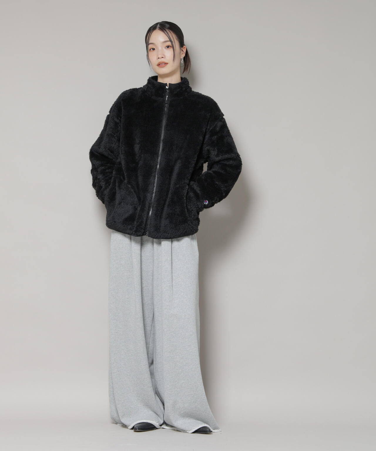 柔らかい肌触りでふわふわと毛足が長く、上品な光沢が魅力のシェルパフリース素材のジップジャケット