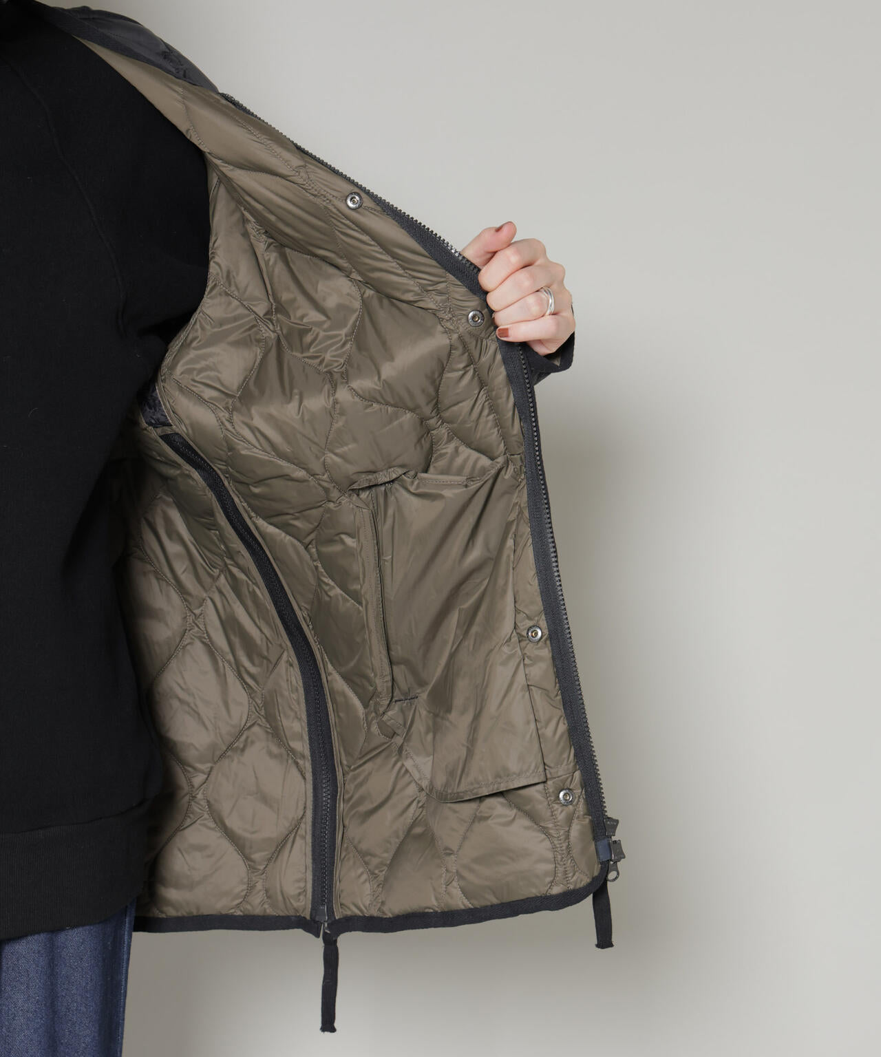 ・コートのインナーダウンにはもちろん、ハイネックトップスやパーカーに羽織ったスタイルも好相性な一着
