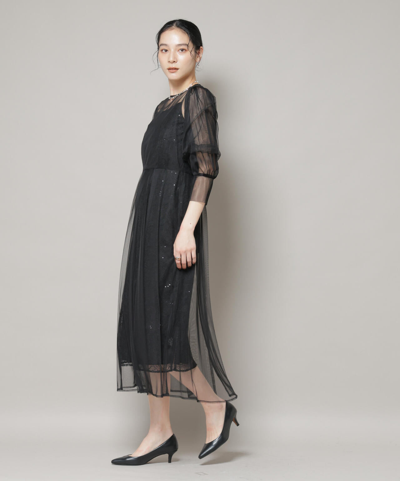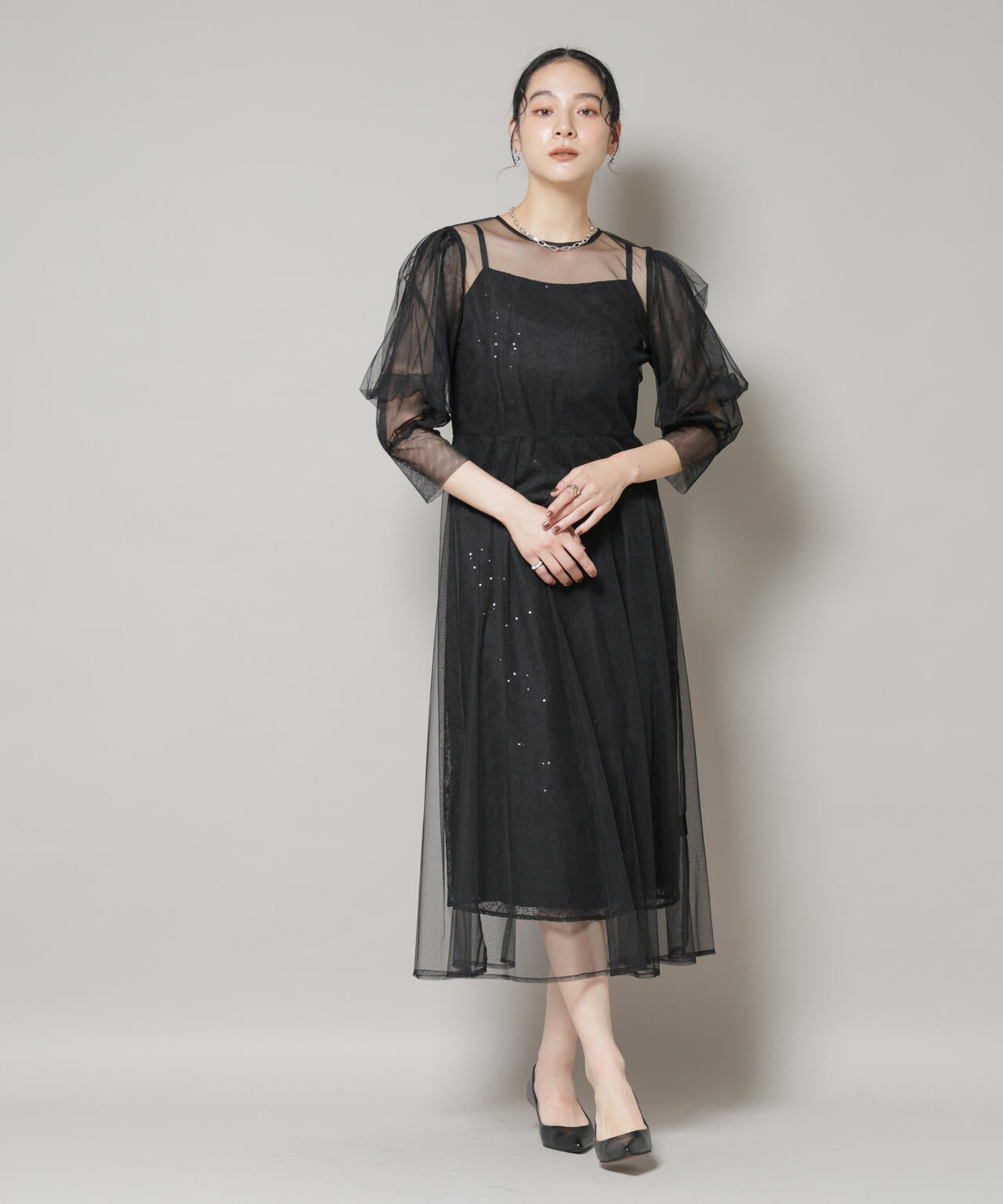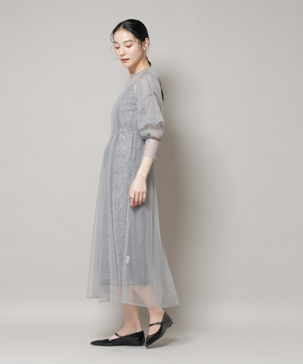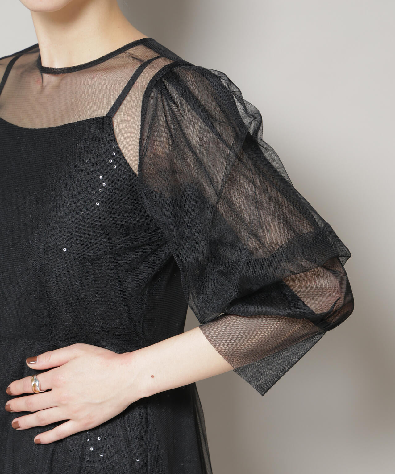 繊細な煌めきと軽やかな透け感が重なり合い、フェミニンでドレッシーなスタイリングを演出