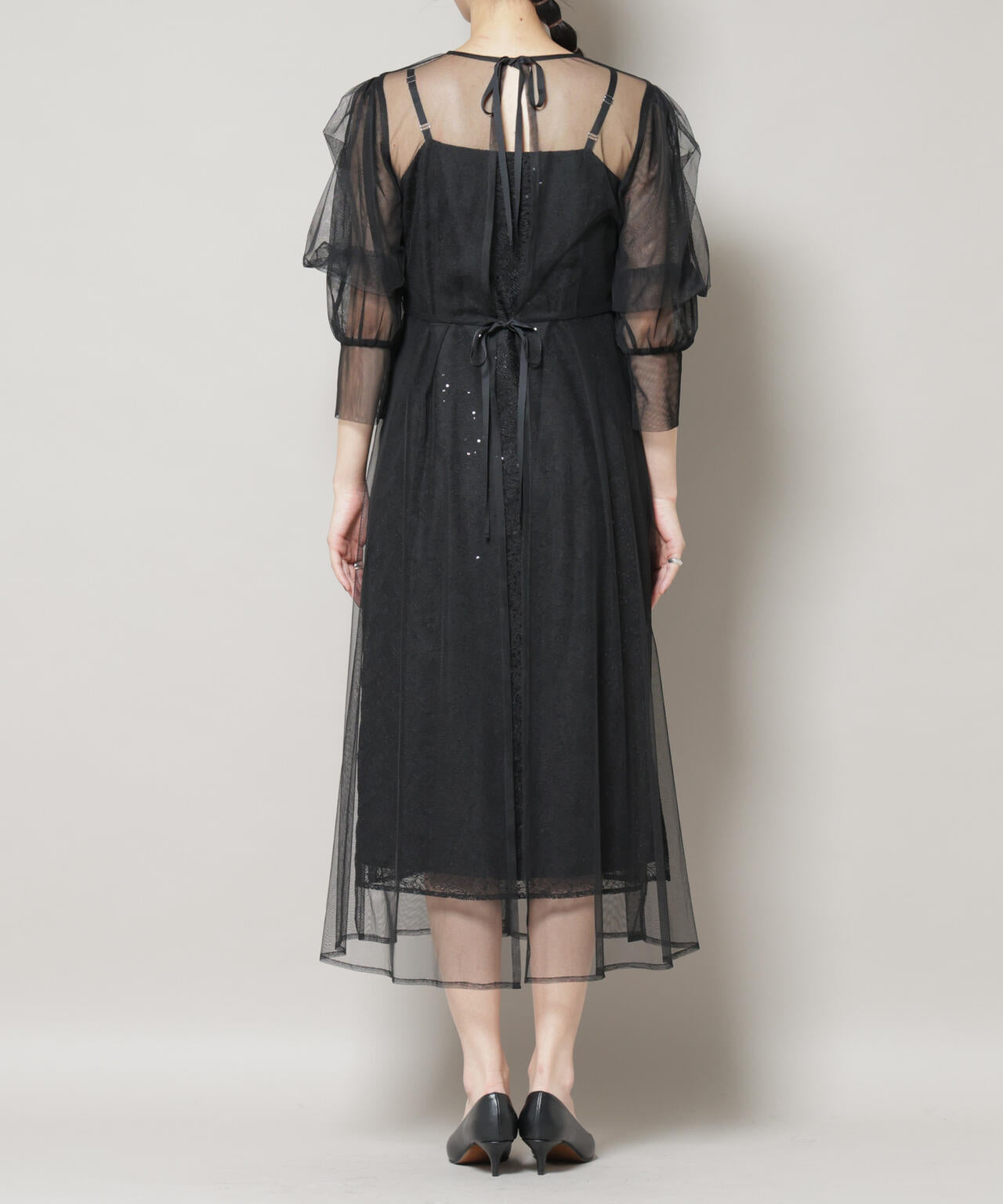 ・後ろ姿も様になる背中でリボンを結んで着用するデザイン