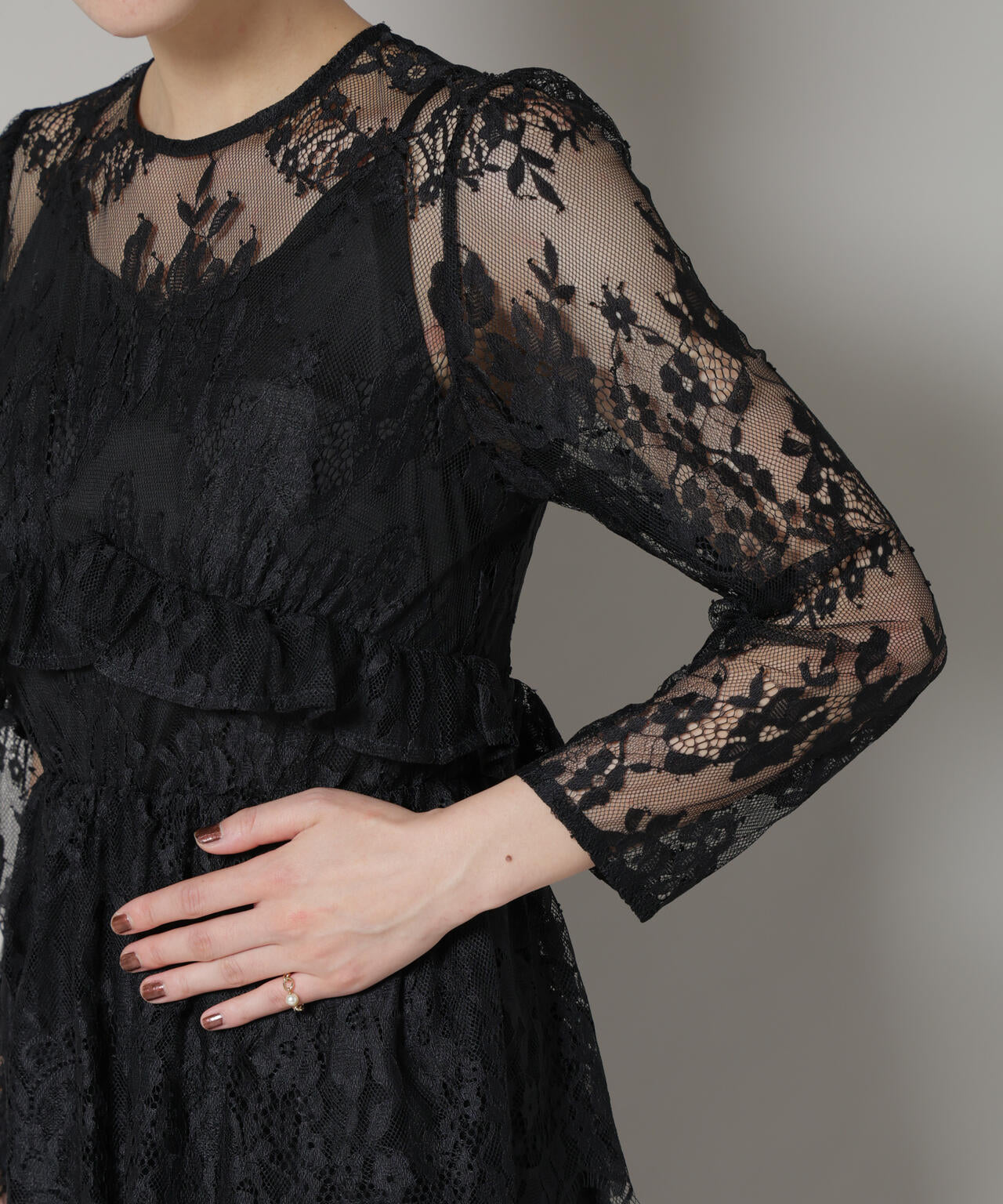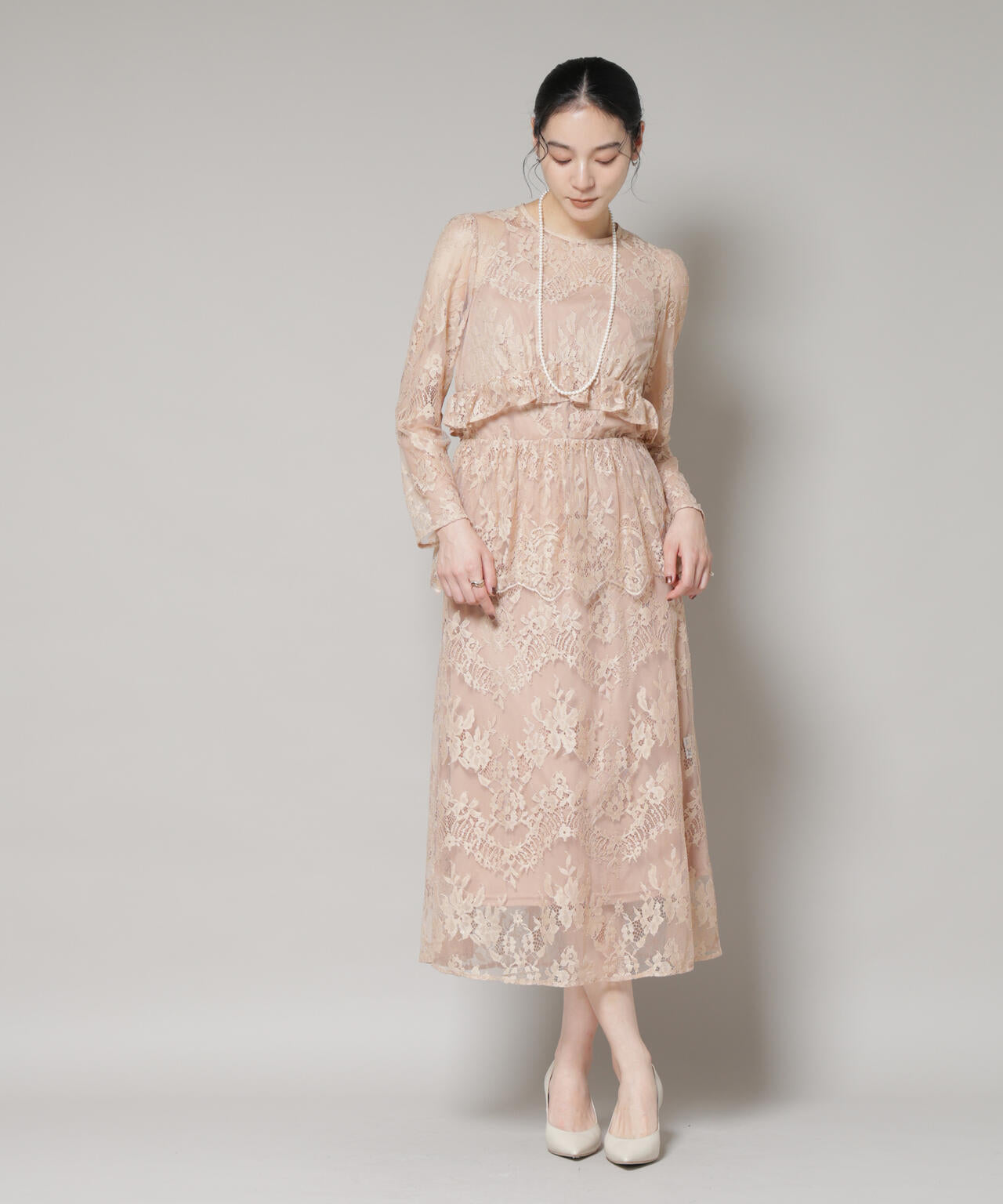 繊細なラッセルレースが華やかな印象のワンピース。高めの位置に配したフリルディテールとペプラム仕様が、トレンド感とスタイルアップを叶えてくれるデザインです。