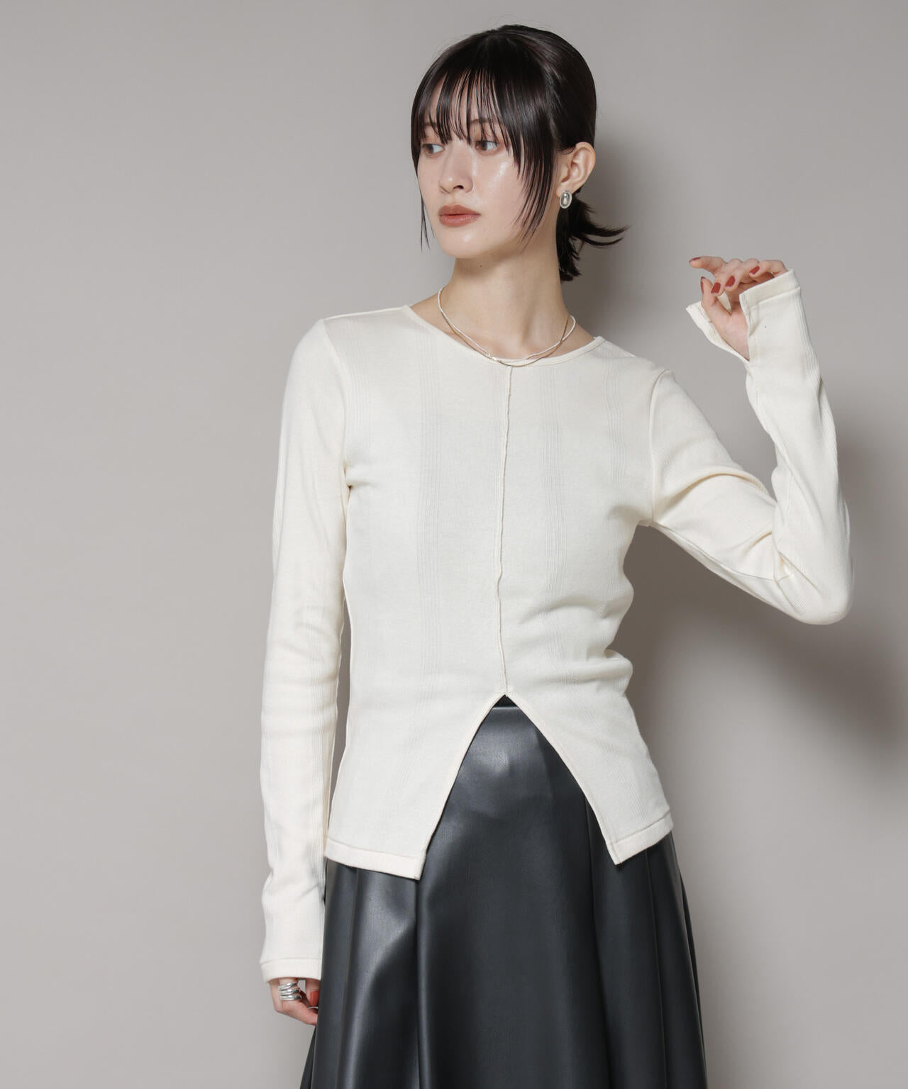 ・さりげない肌見せでトレンド感を演出できるフロントのスリットデザイン