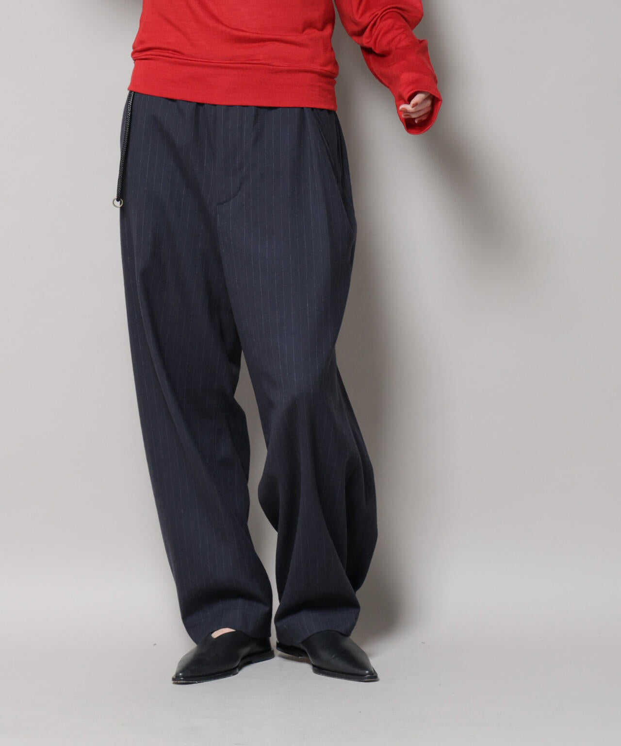 裾の2段階のアジャストドットボタンで、ペグトップのような裾にタックの入ったシルエットにも変更が可能