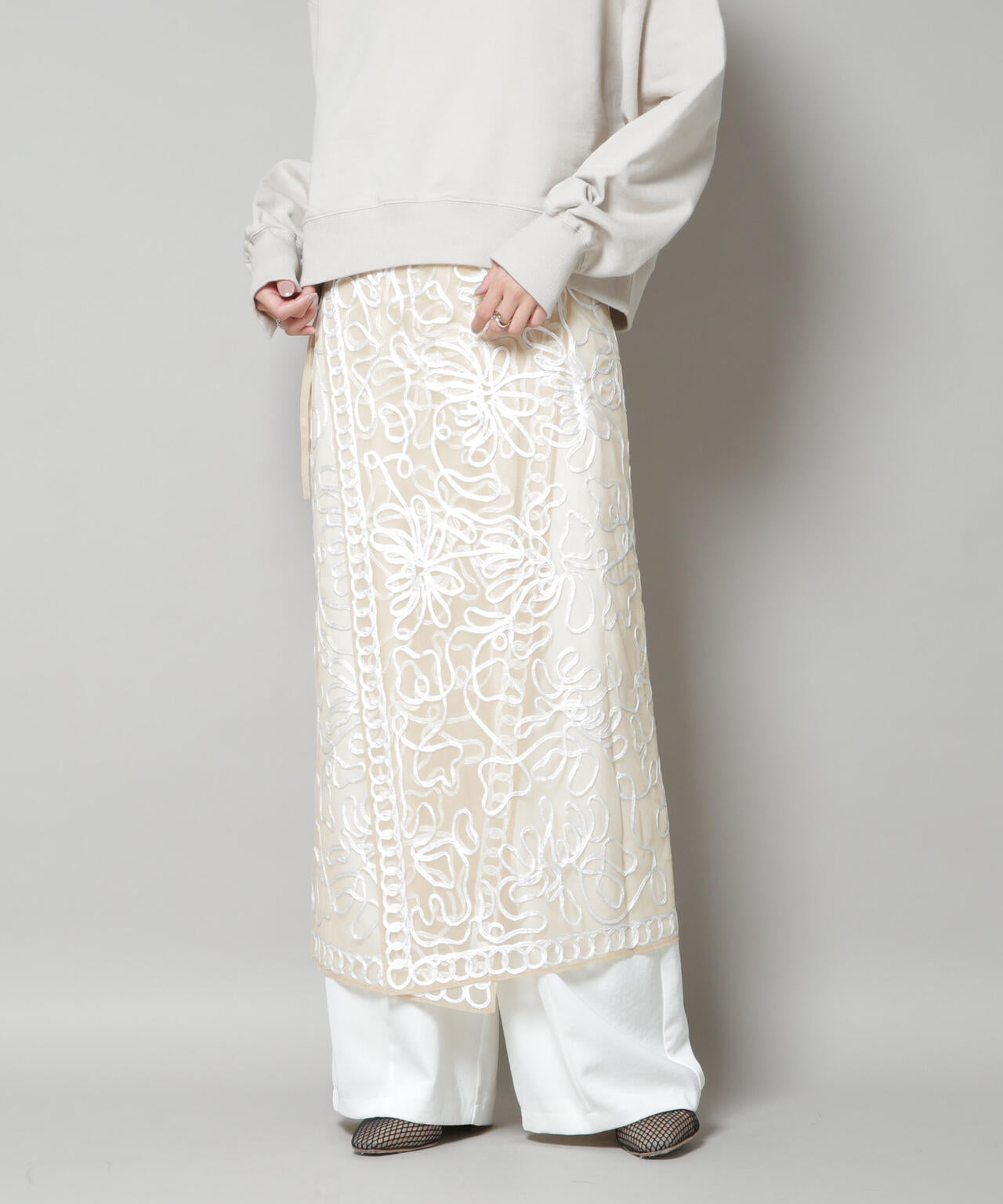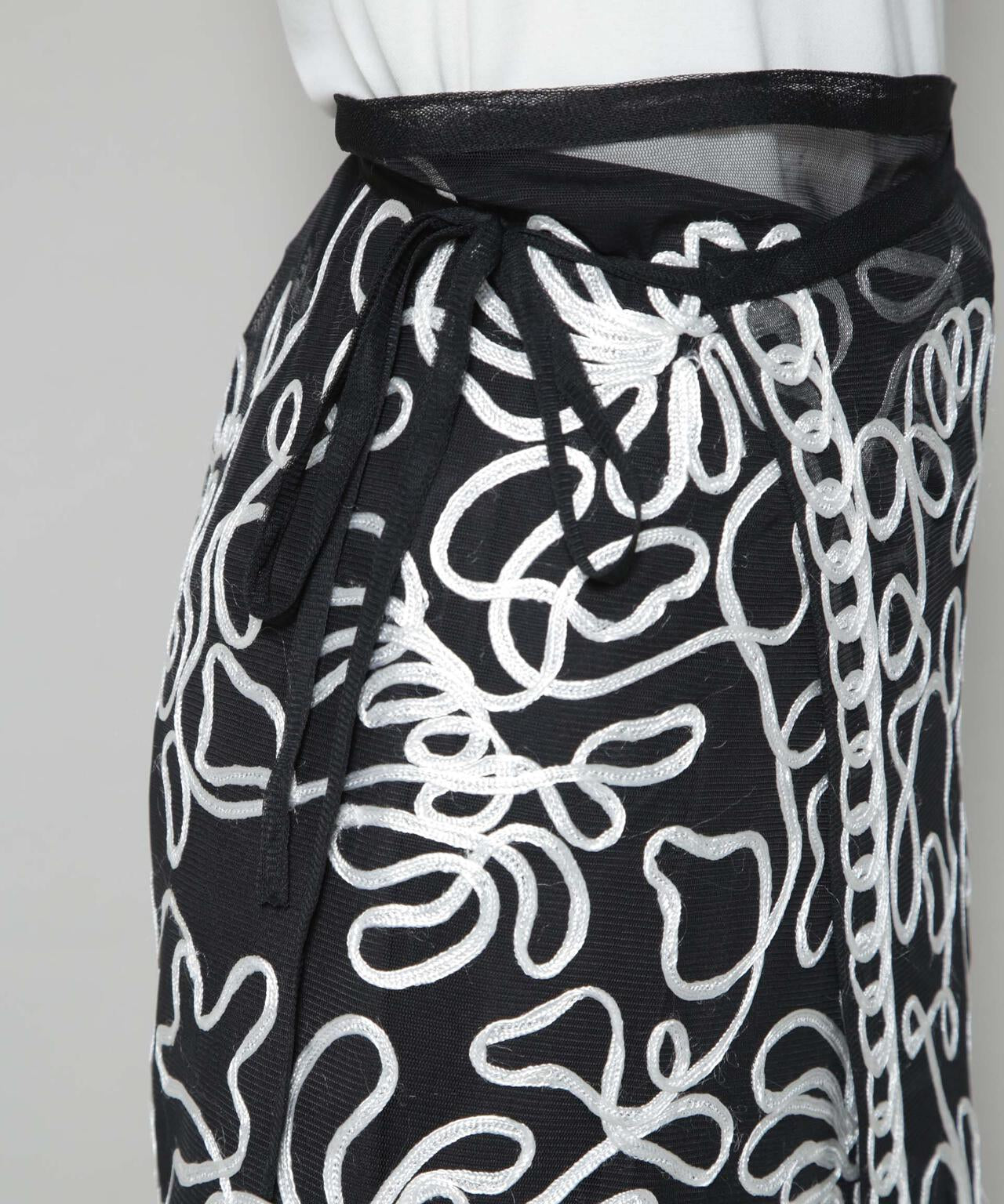 軽やかさが魅力のチュールのラップスカート。ふんわりとしたチュール素材に刺しゅうモチーフが浮かび上がる、存在感ある一枚。繊細ながらも華やかで、シンプルなスタイリングに今っぽいハンドクラフト感をプラスしてくれるレイヤードアイテムです。