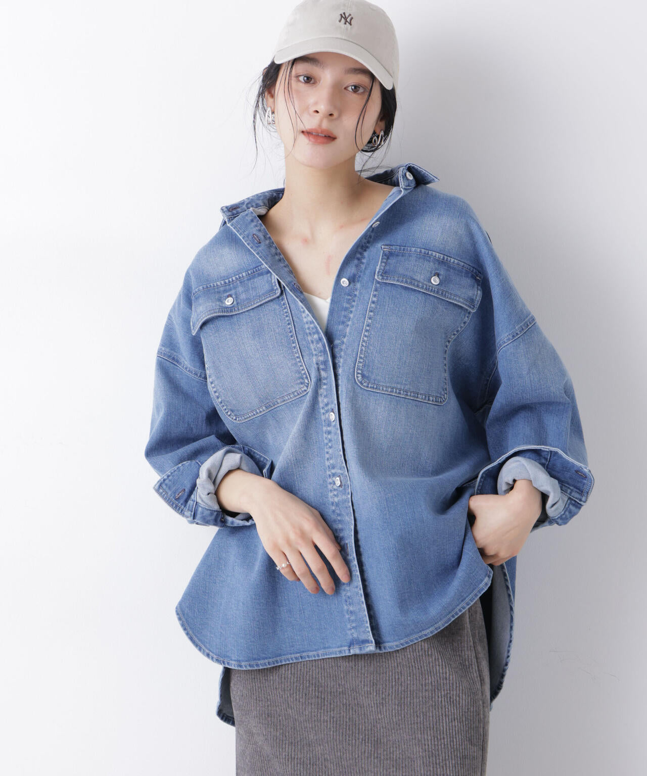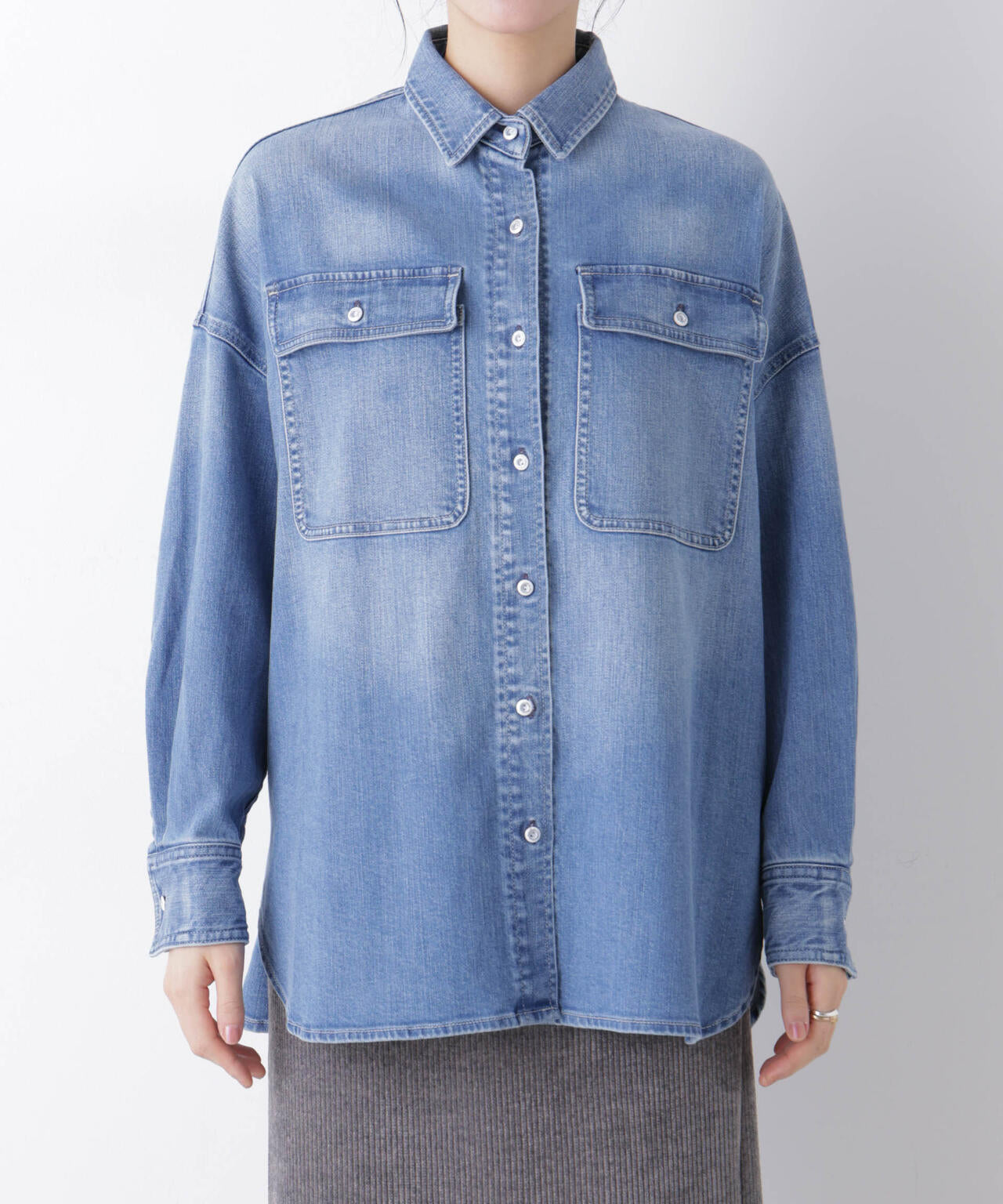 デニムブランド「ヘルシーデニム」で定番人気の「Almond」をベースに別注したデニムシャツ。着丈を短く調整し、今っぽく着回しやすいバランスに仕上げました。フロントを開けて端境期の軽アウターとしても着回せるので、幅広い着こなしが叶うアイテムです。